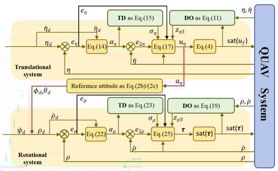 Several classic control strategies have been extensively explored for QUAVs, including proportional–integral–derivative (PID) control [4] and linear quadratic regulator (LQR) control [5]. The sliding mode control (SMC) method, known for its ease of implementation, strong robustness, and fast response, has been applied to control UAVs in the presence of external disturbances [6]. Nonsingular fast terminal SMC has been proposed to achieve finite-time tracking and enhance system robustness [7,8], while a cleverly designed finite-time robust controller was introduced for uncertain time-delay systems [9].