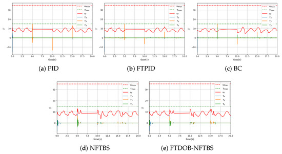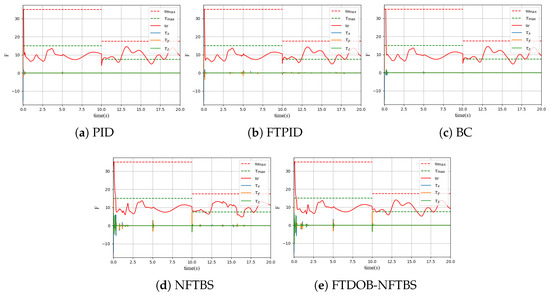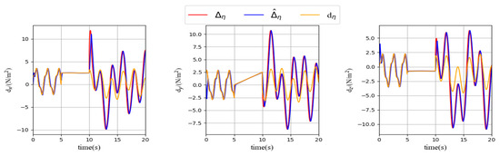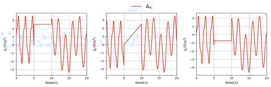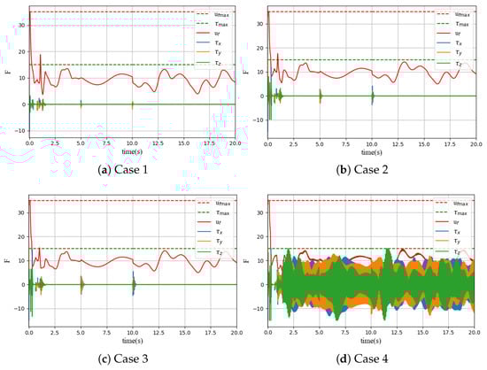 In the simulation, the actuator failure indicators are set to and after 10 s to demonstrate partial actuator failure. Figure 7 shows the disturbance observer output and the total disturbance, which includes both the extra disturbance and the actuator failure. The red curve represents the true total disturbance, encompassing both the extra disturbance and actuator failure. The blue curve shows the output of the FTDO, while the orange curve represents the true extra disturbance. The noticeable difference between the orange and red curves highlights the impact of the system actuator failure. The results demonstrate that the FTDO used in this paper can quickly and effectively track the total disturbances . Figure 8 displays the system’s constrained inputs, with the dashed red and green lines representing the upper bounds of and , respectively. It is important to note that these upper bounds decrease correspondingly as the actuator experiences partial failure.