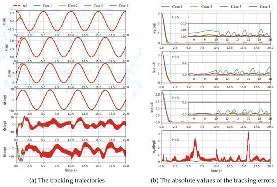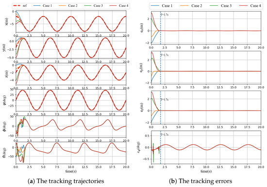 where and are defined to evaluate the system tracking errors within 5–10 s without actuator failure. and are defined to evaluate the system tracking errors within 10–20 s when the actuator failure occurs. The results are listed in Table 3.