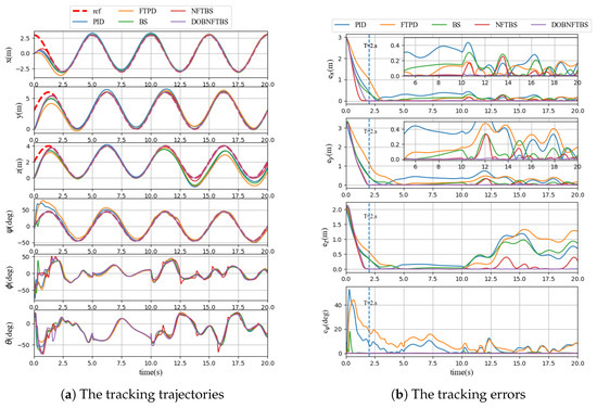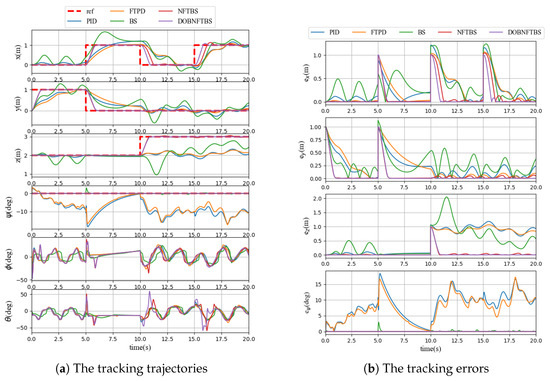 In summary, all controllers are capable of stabilizing the QUAV in the absence of actuator failure. However, the errors observed with the NFTBS controller and the FTDOB-NFTBS controller are significantly smaller compared with the other three controllers. The error convergence speed is also significantly faster than other controllers. Furthermore, Figure 12b shows that the tracking errors with the NFTBS and FTDOB-NFTBS controllers can always converge to very small regions within 2 s for suddenly changed reference points. When actuator failure occurs, the position tracking errors with the PID, FTPD, and BC controllers become unacceptably large, with errors along the Z-axis around 1 m. The FTDOB-NFTBS controller exhibits the best performance, with its position tracking error being less than half of that of the NFTBS. This highlights the effectiveness of the proposed FTDOB-NFTBS control framework, which demonstrates superior performance in quickly and accurately tracking the reference signal while mitigating the effects of external disturbance and actuator failure, even for the suddenly changed reference points.