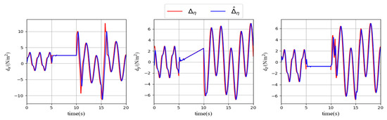 Similar to Case 1, the actuator failure indicators are set to and after 10 s to demonstrate partial actuator failure. Figure 10 shows the disturbance observer output and the total disturbance, which includes both the extra disturbance and the actuator failure. The red curve represents the true total disturbance, encompassing both the extra disturbance and actuator failure. The blue curve shows the output of the FTDO. Figure 11 displays the system’s constrained inputs, with the dashed red and green lines representing the upper bounds of and , respectively. It is important to note that these upper bounds decrease correspondingly as the actuator experiences partial failure.