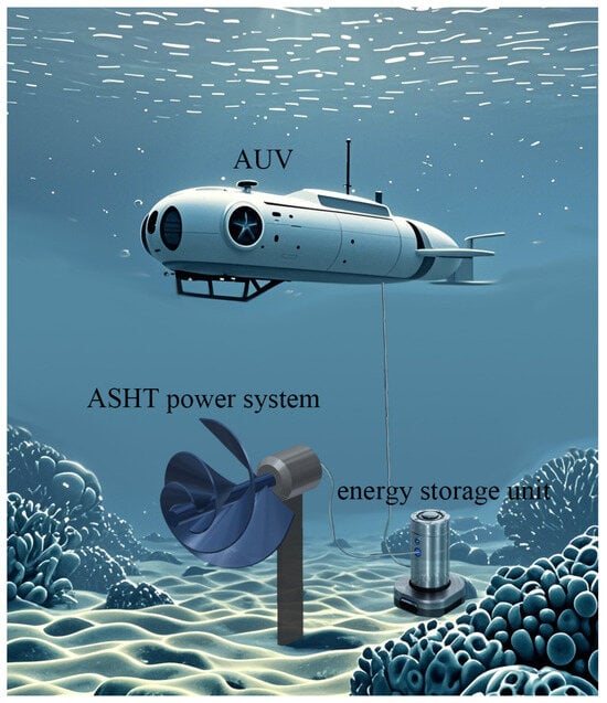In deep-sea exploration, the regions below 300 m are among the least explored areas on Earth, yet they represent the largest habitats in terms of both area and volume []. The deep sea plays a crucial role in global climate regulation and harbors abundant energy, mineral, and biological resources []. To gain a deeper understanding of these resources and to conduct effective exploration, deep-sea scientific research requires extensive observational data to support project planning and marine environmental management []. Currently, the implementation of this technology relies on the collaborative operation of various detection devices to acquire ocean data, which has not yet been thoroughly explored. Common devices include autonomous underwater vehicles (AUVs) [,,,], which are widely used in offshore platform monitoring, seabed exploration, and oceanographic sampling. However, most AUVs are powered by batteries, which limits their endurance due to energy storage constraints []. To address this issue, traditional solutions often require power supplies through cable connections or other infrastructure; these methods are not only costly but also restrict the deployment range of the equipment, especially in deep-sea areas. Additionally, the complexity of the marine environment makes power replenishment a significant bottleneck in deep-sea exploration [].