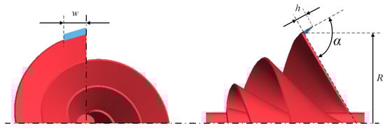 The geometric characteristics of a winglet are illustrated in Figure 3. In this illustration, the variables are defined as follows: R indicates the rotor radius (excluding the winglet); α signifies the angle of the winglet; w denotes the length of the winglet; and h represents the height of the winglet. Throughout the analysis presented in this paper, the length w is consistently maintained at 30 mm. Additionally, it is important to highlight that the winglets examined in this research are designed to curve towards the suction side of the blade, which faces downstream, thereby enhancing the performance of the turbine more efficiently [].