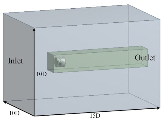 At the inlet, a constant water velocity of 0.5 m/s (V0) was maintained, while the outlet was configured as an outflow boundary. The center of the turbine was positioned 5D (turbine diameter) from the inlet and 10D from the outlet. A non-slip boundary condition was applied to the turbine, whereas the surrounding boundary of the stationary domain was assigned a free slip condition.
