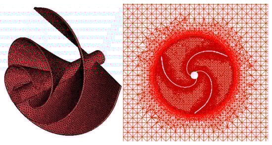 In the realm of pressure–velocity coupling, the COUPLED scheme is utilized. The preference for unstructured grids stems from their cost-effectiveness and the ease with which they can be generated automatically []. However, it is crucial to meticulously manage the grid quality parameters, including the orthogonality, skewness, and aspect ratio, particularly in relation to the grid density. Research indicates that maintaining Y+ values at 15 or below is appropriate when employing the SST model []. To improve the discretization of the boundary layer, a smooth transition algorithm was implemented, which incorporated ten prism layers. The mesh details of the original ASHT are depicted in Figure 5. The height of the initial layer is set to 0.038 mm, which satisfies the condition y+ = 1, with a growth rate of 1.1. This approach enhances the boundary layer resolution by reducing the dimensional disparity between the last prism layer and the first polyhedral element. Furthermore, it is essential to recognize that the accurate simulation of flow patterns requires careful consideration. Mesh refinement is particularly concentrated around the rotor and the downstream wake region to ensure precise simulations [,]. The total grid count is approximately 6 million, with 2.8 million allocated to the rotating domain.
