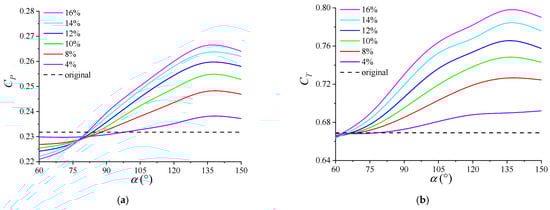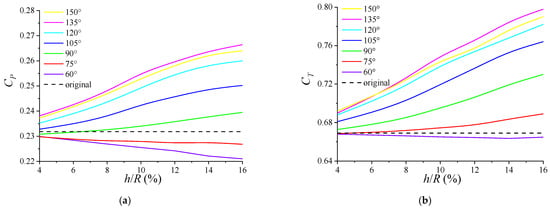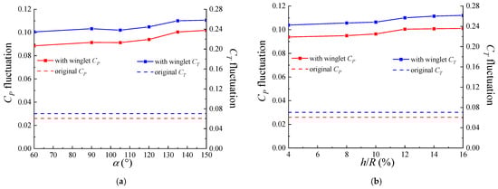 and initially increase before subsequently declining, with the sole exception being at h/R = 4%. Taking h/R = 14% as an example, when the winglet angle reaches 105°, improves by 7.2% compared to the original ASHT, while increases by 12.5%. As the winglet angle rises to 120°, grows to 11.3%, and escalates to 14.8%. As the winglet angle further rises to 135°, grows to 13.7%, and escalates to 17.2%. In addition, the winglet angle at 135° consistently demonstrates the highest and values across all conditions. Moreover, it is worth noting that, when the angle is less than 90°, the presence of a winglet has only a negative impact on the power of the ASHT. Therefore, the winglet angle must be ensured to be at least above 90°.