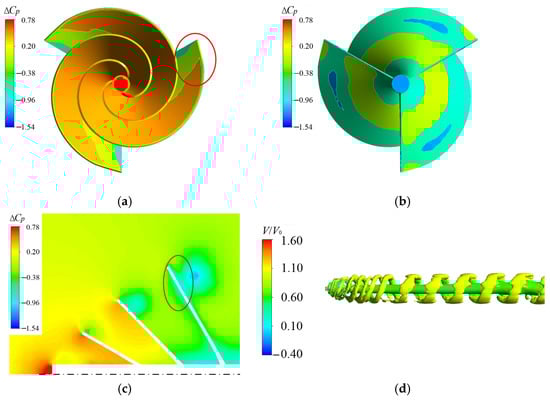 Before delving into the main discussion, it is necessary to clarify the hydrodynamic characteristics of the initial ASHT under the operating conditions. Figure 9a,b display the pressure coefficient contours on the pressure side and suction side of the ASHT blades, respectively. Figure 9c illustrates the distribution of the pressure coefficient contours near the blades, while Figure 9d presents the three-dimensional (3D) vortex structures of the original ASHT at a Q-criterion level of 0.1. The pressure coefficient contour is a very important visualization tool that can intuitively display the pressure changes of an ASHT in a specific area, allowing for the identification of important features in the flow field and thus evaluating its performance. The Q-criterion is also a valuable technique in characterizing the instantaneous structures of vortices, effectively illustrating the 3D configurations present within the flow field. The 3D vortex formations are depicted by the magnitude of the resultant velocity in the flow field [].
