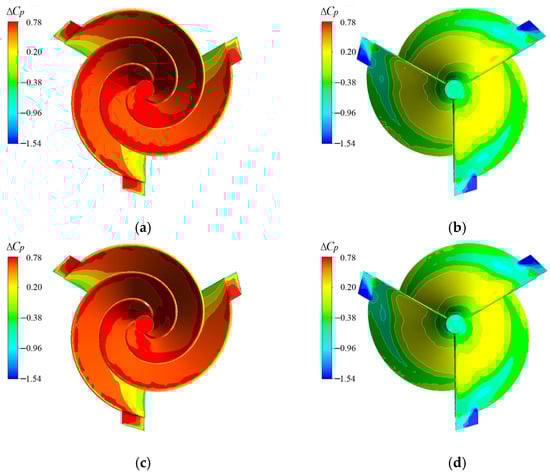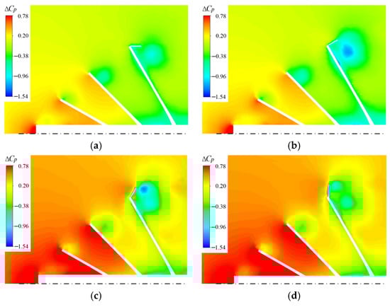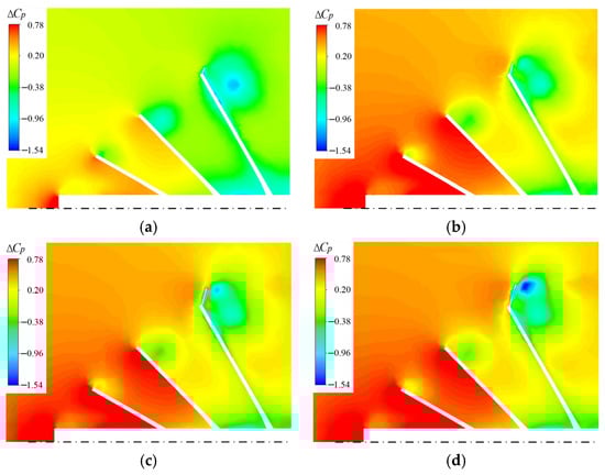 Pressure coefficient () contours near blade at fixed winglet angle of 135° and different winglet height ratios: (a) h/R = 4%; (b) h/R = 8%; (c) h/R = 12%; (d) h/R = 16%.