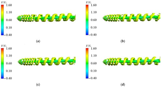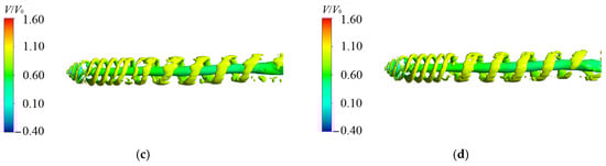 Three-dimensional vortex structures colored by velocity at fixed winglet height ratio of h/R = 12% and different winglet angles: (a) α = 60°; (b) α = 90°; (c) α = 120°; (d) α = 150°.