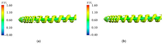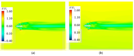 Velocity distribution of the ASHT with winglets at h/R = 12% and α = 135°: (a) uniform flow; (b) shear flow.