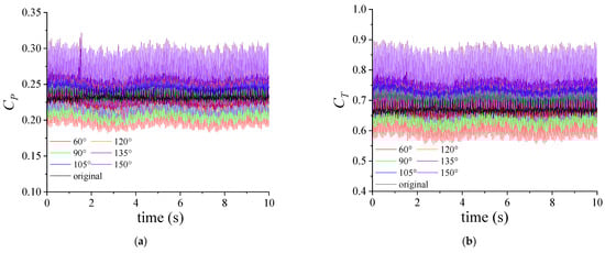 and versus time at fixed winglet height ratio of h/R = 12% and different winglet angles: (a) ; (b) .