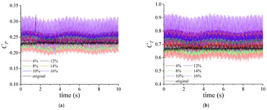 Figure 14 and Figure 15 illustrate the relationship between and over time. Figure 14 emphasizes a constant height ratio of h/R = 12% while varying the angle, whereas Figure 15 maintains a fixed angle of 135° and varies the height ratio. Additionally, Figure 16 presents the corresponding average fluctuation results. The time series data for and for the ASHTs with various winglet designs exhibit clear periodic oscillations, demonstrating similar time-dependent patterns because the rotational speed remains constant. Nonetheless, the amplitude of these fluctuations varies. It is evident that, as the winglet angle and height ratio increase, the overall load fluctuations tend to rise. For example, with the winglet height ratio held constant, when the winglet angle reaches 90°, the fluctuation in intensifies by a factor of 3.51 compared to the original ASHT, while the fluctuation in intensifies by a factor of 3.42. As the winglet angle rises to 120°, the fluctuation intensifies to 3.61 times, and the fluctuation intensifies to 3.47 times. When the winglet angle is further increased to 150°, the fluctuation intensifies to 3.91 times, and the fluctuation intensifies to 3.66 times. Conversely, when the winglet angle is fixed and the winglet height ratio reaches 8%, the fluctuation intensifies by 3.65 times compared to the original ASHT, while the fluctuation intensifies by 3.50 times. As the winglet height ratio increases to 12%, the fluctuation rises to 3.86 times, and the fluctuation intensifies to 3.65 times. When the winglet height ratio is further increased to 16%, the fluctuation intensifies to 3.88 times, and the fluctuation intensifies to 3.71 times. The reason for this is that a larger angle and height ratio in the winglet result in increased disturbances, which subsequently raise the drag and lead to greater fluctuations. Furthermore, it is important to highlight that the ASHT equipped with winglets displays a load fluctuation trend that is entirely contrary to that of traditional lift-type HAHTs, where an increase in winglet size leads to a decrease in blade load fluctuations []. Therefore, although an ASHT with a larger winglet angle and height ratio has higher output power, it also brings about stronger load fluctuations, which may lead to a fatigue problem and the need for structural reinforcements.