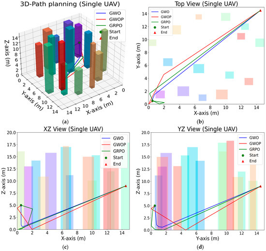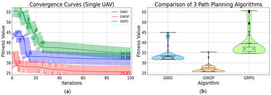 - In the single UAV 3D trajectory planning experiment, the improved GWOP algorithm reduces the FV (fitness value) by 18.84%, 19.86%, and 18.13% at 100, 300, and 500 iterations, respectively, yielding an average reduction of 18.94% across all three. The NOC (number of collisions) is reduced from 2 to 0. Compared with the classic GRPO algorithm, the FV reductions are 25.88%, 18.75%, and 2.91% at the same iteration levels, with an average reduction of 15.85%, and the NOC is reduced from 1 to 0. These results highlight the algorithm’s superior path optimization capability and robust obstacle avoidance performance.