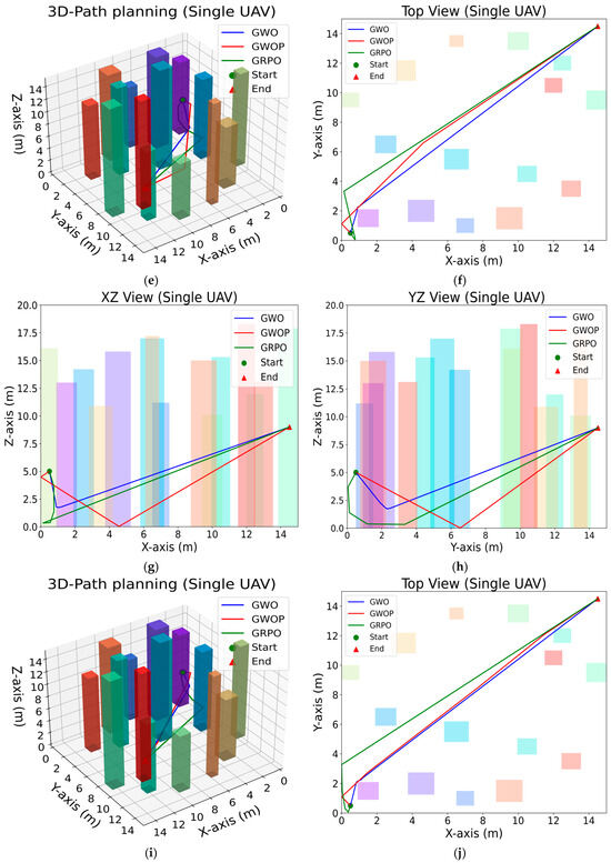 From Figure 19a,b, it can be observed that the improved double-layer fusion GWOP algorithm reduces the APL index by 4.08% compared to the GWO algorithm, the OPL index by 14.08%, and the FV index by 26.80%. Compared with the GRPO algorithm, the reductions are 13.96% for APL, 24.73% for OPL, and 32.86% for FV. These results further confirm the effectiveness of the improved GWOP algorithm in multi-UAV trajectory planning.