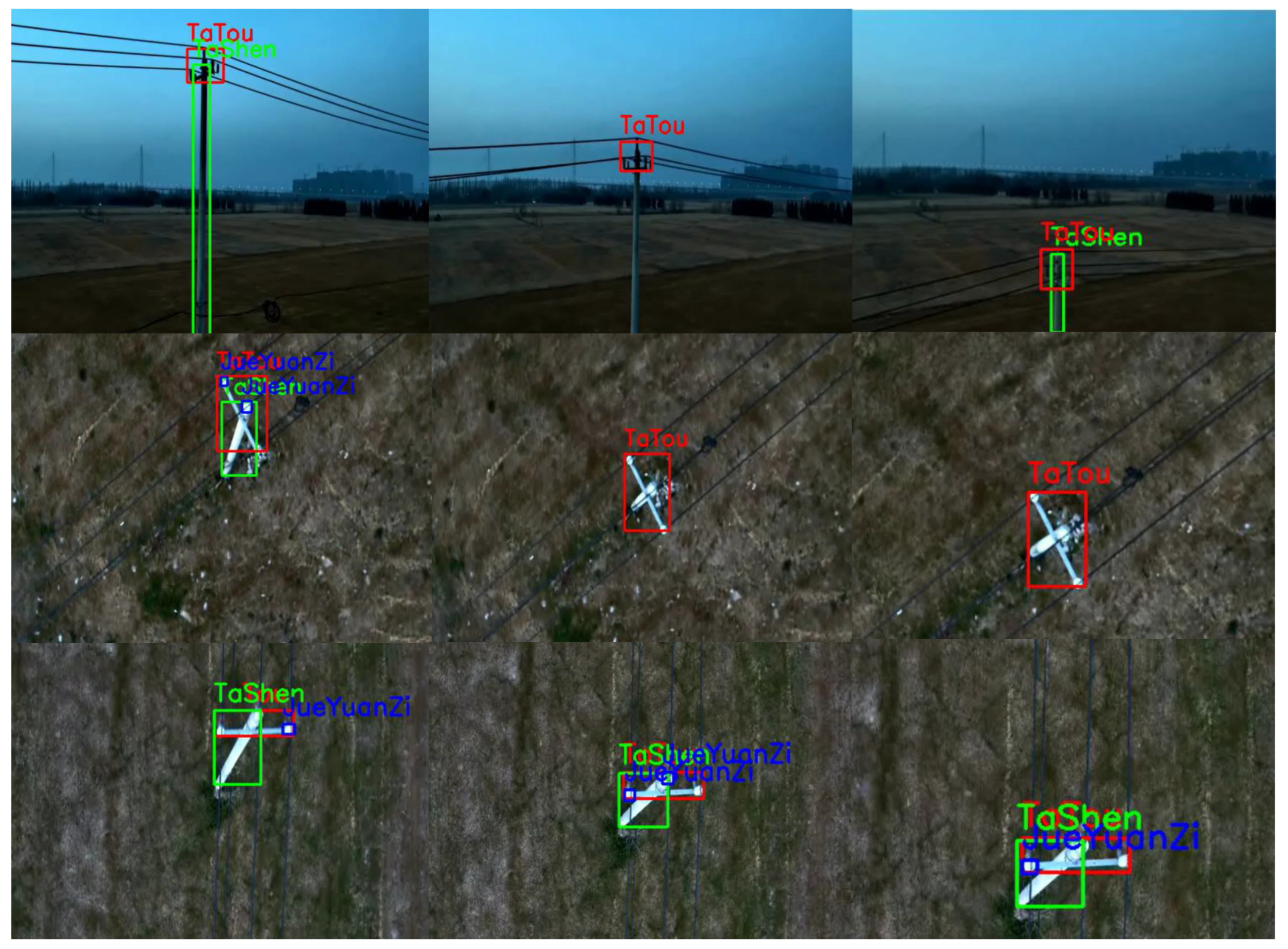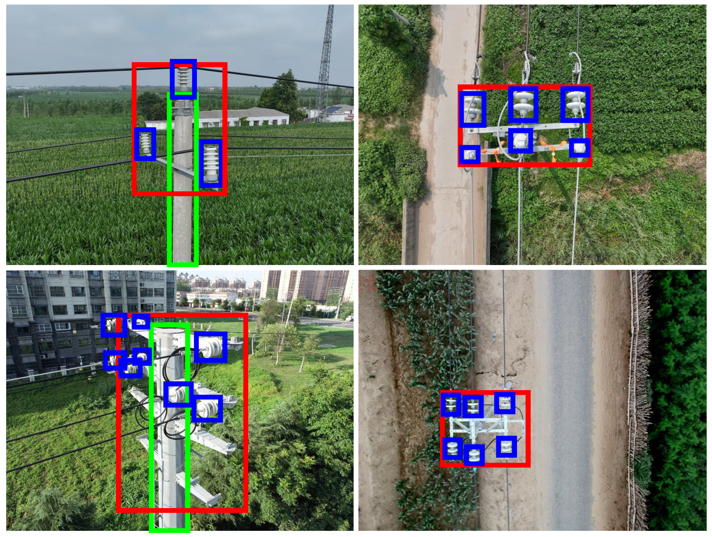 According to the requirements of the proposed flight route estimation, the tower object is defined to include three key components: the tower head, tower body, and insulator, as illustrated in Figure 1, which are indicated by red, green, and blue bounding boxes, respectively. As shown in Figure 1, the tower head—serving as the primary reference point for UAV localization—possesses distinctive visual features, occupies more pixels in the image, and is less likely to be occluded, thereby providing stable and continuous localization information. Due to its slender structure, the tower body is typically the first component to enter the UAV’s field of view and can assist in tower localization when the tower head is not detectable. The insulator, on the other hand, is primarily used for close-range detection to avoid collisions when the UAV approaches the tower.
