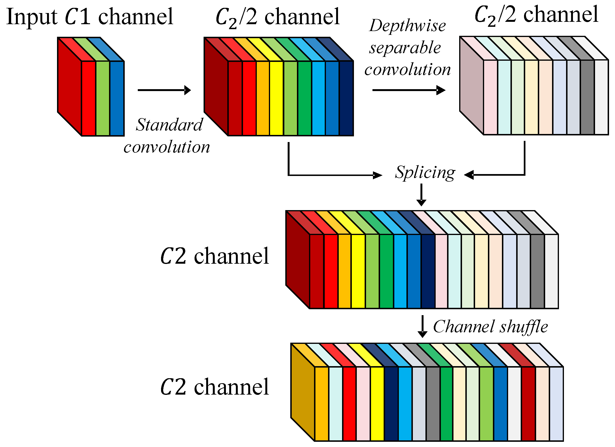 In the computation process, let the input channels be C 1 and the output channels be C 2 . First, the input undergoes a standard convolution operation to produce a feature map y 1 with C 2 / 2 channels. This branch mainly captures high-level semantic features across channels, thereby preserving the representational capacity of the network. Then, y 1 is further processed by depthwise separable convolution to generate an output y 2 , also with C 2 / 2 channels. This branch retains local feature extraction ability while significantly reducing computational cost and parameter count. Next, y 1 and y 2 are concatenated to form a feature map y 3 with C 2 channels. Finally, a channel shuffle operation is applied to break the isolation between branches, enabling information exchange and fusion, and yielding the final output y.