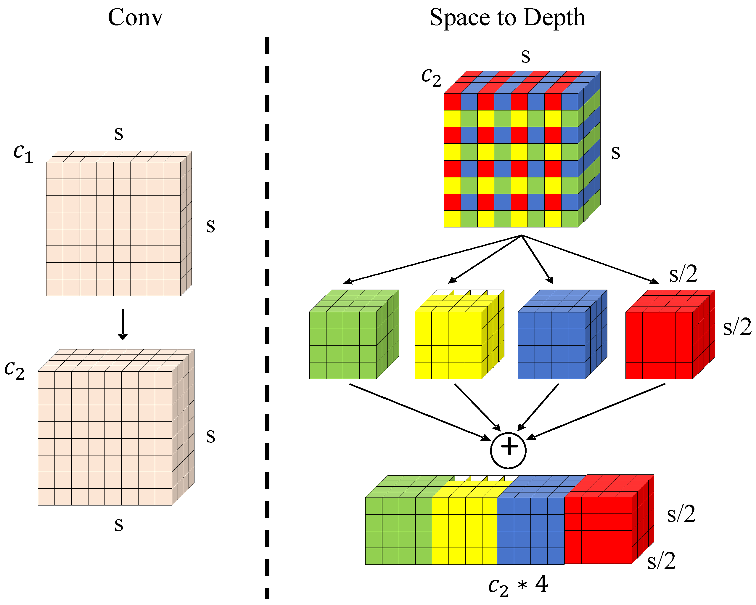 In this structure, assume that the initial input feature map has a spatial size of s × s and c 1 channels. First, a non-strided convolution layer is applied for feature encoding, which preserves the spatial resolution while expanding the channel dimension to c 2 . Then, an SPD transformation with a scale factor of 2 decomposes the original feature map into four sub-feature maps, each with a spatial size of s / 2 × s / 2 , while the channel dimension is expanded to 4 c 2 . This hierarchical feature transformation mechanism overcomes the limitations of conventional strided convolution and pooling operations: during spatial downsampling, it preserves spatial information by losslessly mapping it into the channel dimension, thereby effectively avoiding feature loss. Meanwhile, the fourfold channel expansion operation maintains the spatial distribution patterns of small objects, enabling deeper layers of the network to capture the geometric structures of tiny objects. Such a mechanism significantly alleviates the feature degradation problem caused by traditional downsampling and enhances the model’s performance in small object detection tasks.