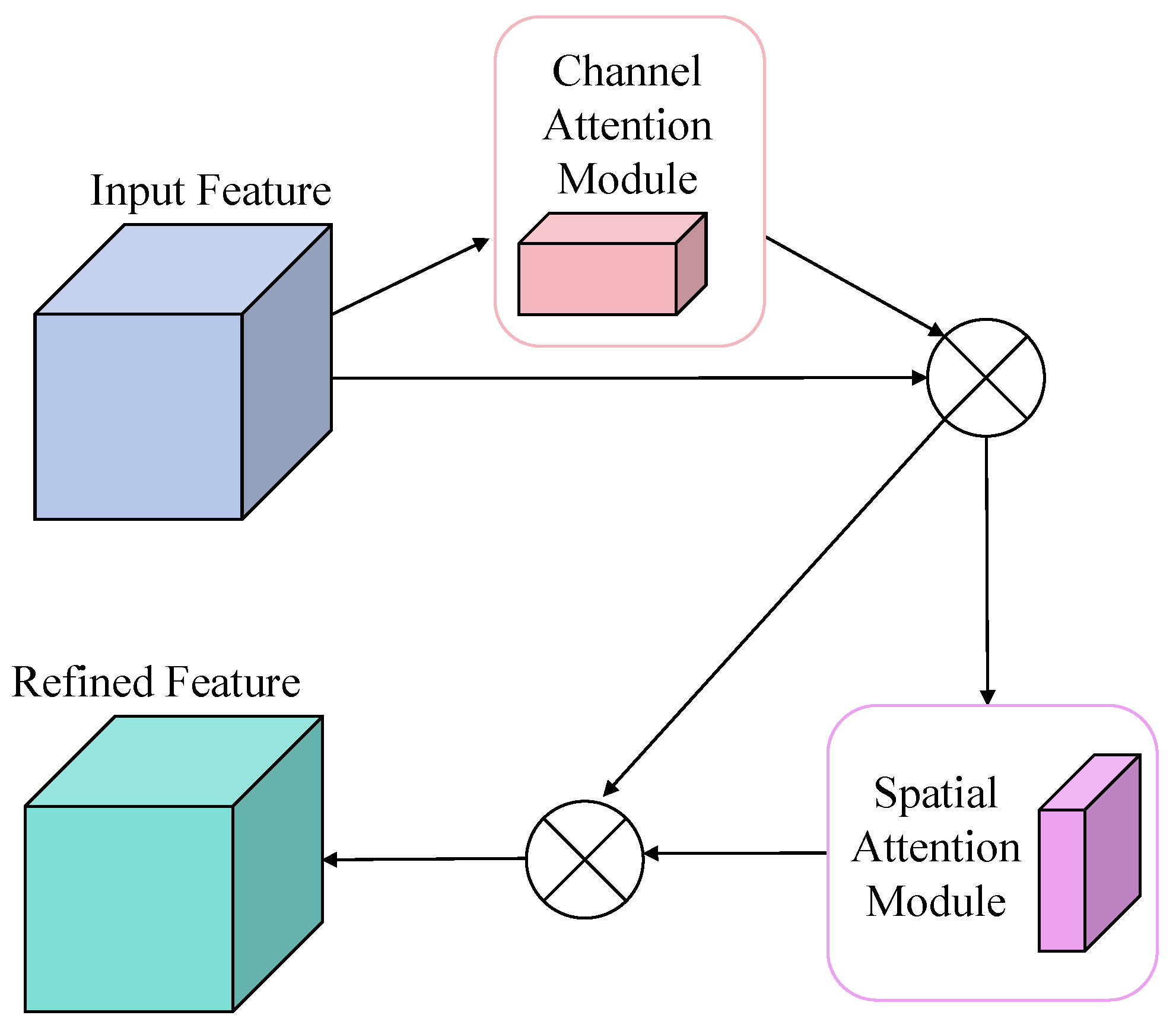 (b) Attention Mechanism. This study also employs the CBAM, a feature enhancement module based on bidirectional attention synergy. It performs multi-dimensional feature calibration through a channel-spatial dual-attention mechanism, providing a dynamic feature selection capability for convolutional neural networks [33]. The structure of CBAM is illustrated in Figure 4.