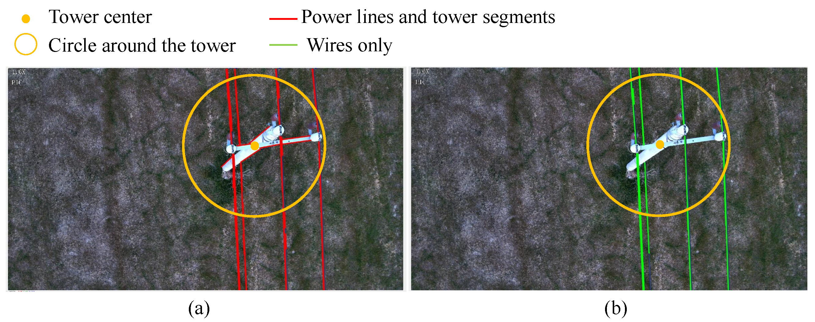 The LSD algorithm was originally used to extract image line segments, but the extracted segments contained a large amount of noise. To address this issue, we propose a center-based filtering method for target identification to eliminate interference: Figure 5a shows the LSD image after removing shorter segments using a threshold filtering method. However, transmission line segments and tower segments themselves remain. By drawing a circle centered at the tower’s center such that it fully encloses the tower, only segments intersecting this circle are retained. Pylon segments, which do not intersect the circle, are discarded, while target distribution lines that intersect the circle are retained. The final output preserves only distribution line segments, effectively eliminating background interference. The filtered result is shown in Figure 5b.