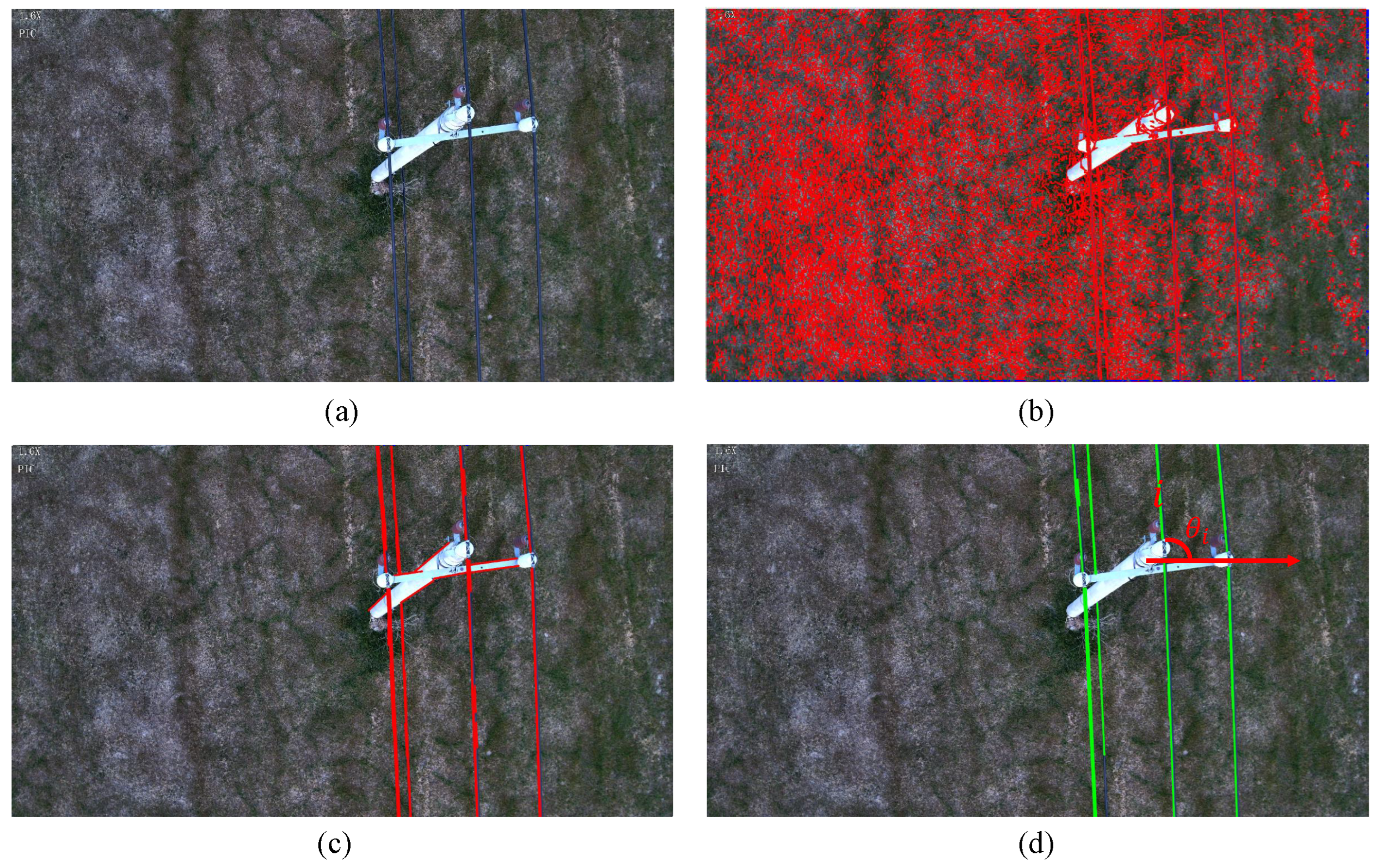 The process of obtaining segment angles is illustrated in Figure 6. Figure 6a shows the original image, while Figure 6b displays the result of extracting all segments from the original image using the LSD segment detection algorithm. As seen, numerous interfering segments remain in the image background. Figure 6c shows the result after applying a thresholding method to filter out segments shorter than a specified threshold. This initial filtering leaves only tower segments and transmission line segments. Figure 6d displays the segments obtained using the center-based filtering method, which filters out tower segments, leaving only transmission line segments. At this point, the preparatory work for cluster analysis is complete. Without segment filtering, these interfering lines would hinder the calculation of the direction between the current tower and secondary towers during cluster analysis, making autonomous drone inspections difficult to perform.