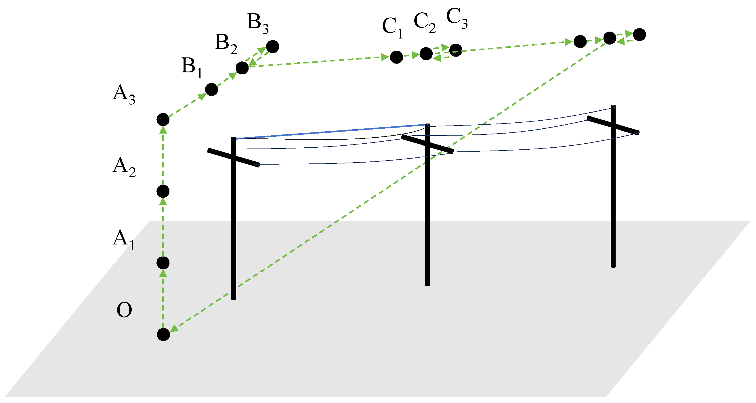 To estimate the flight route, we proposed a real-time waypoint estimation method, which contains two stages, A i , i = 1 , 2 , 3 and B i , i = 1 , 2 , 3 , as shown in Figure 7. In stage A i , the UAV climbs vertically upwards and the gimbal camera distributes the front side of the tower for identification; In stage B i , the UAV flies above the tower, and the gimbal camera looks down on the tower for identification; For subsequent tower, it is realized by repeating stage B i .
