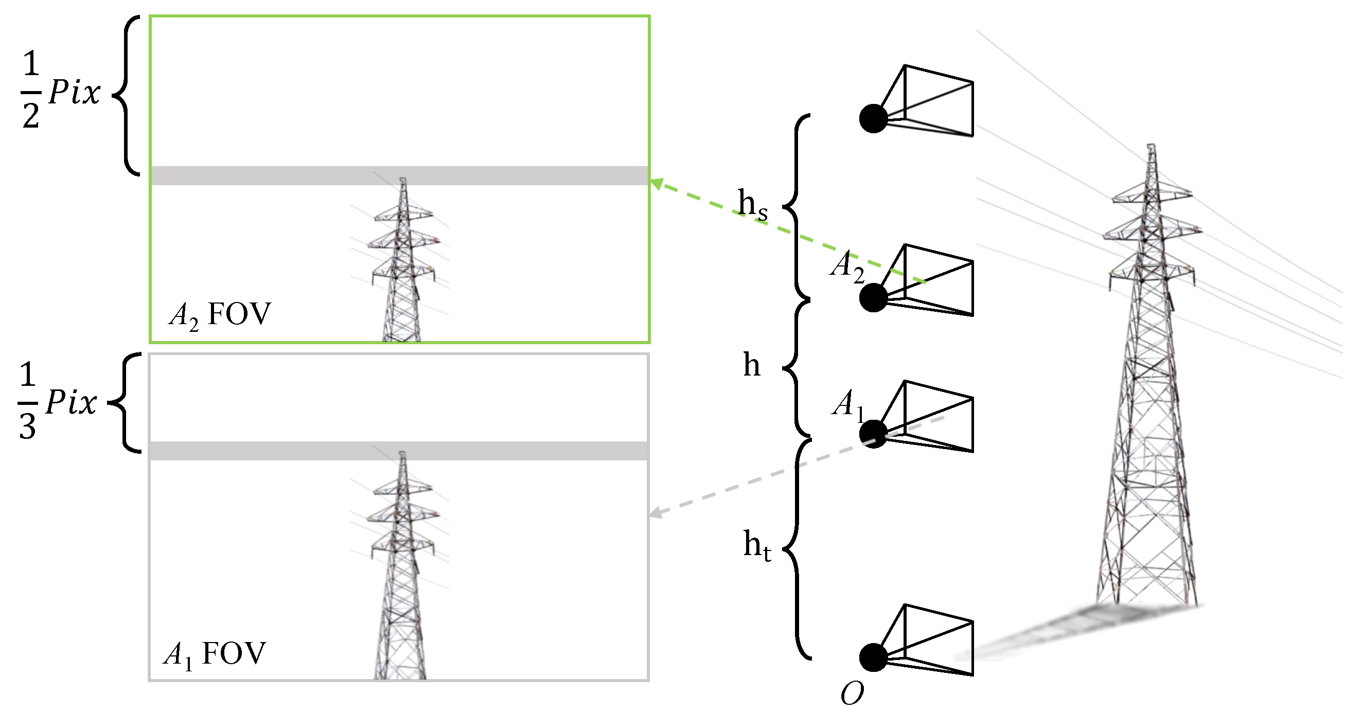 where V F O V is the vertical view field of the image, ( X , Y ) is the image resolution, ( x i , y i ) denote the pixel coordinates of the tower head’s center point. h is the height UAV raised, and d is the approximate distance of UAV to tower, as shown in Figure 9.