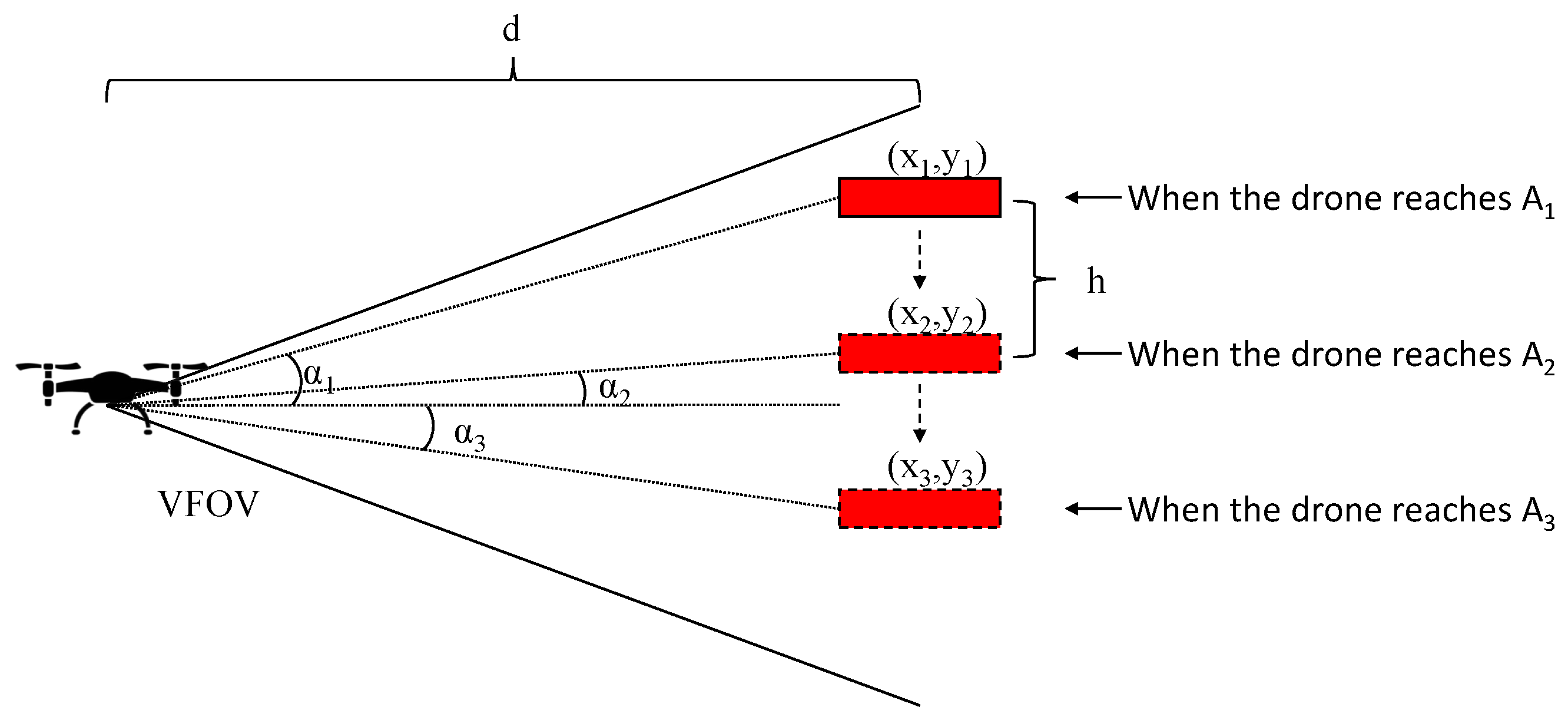 Once the pixel coordinates of A 1 , A 2 , and A 3 are collected with the corresponding UAV states, the UAV-to-tower distance can be calculated with the following formula: