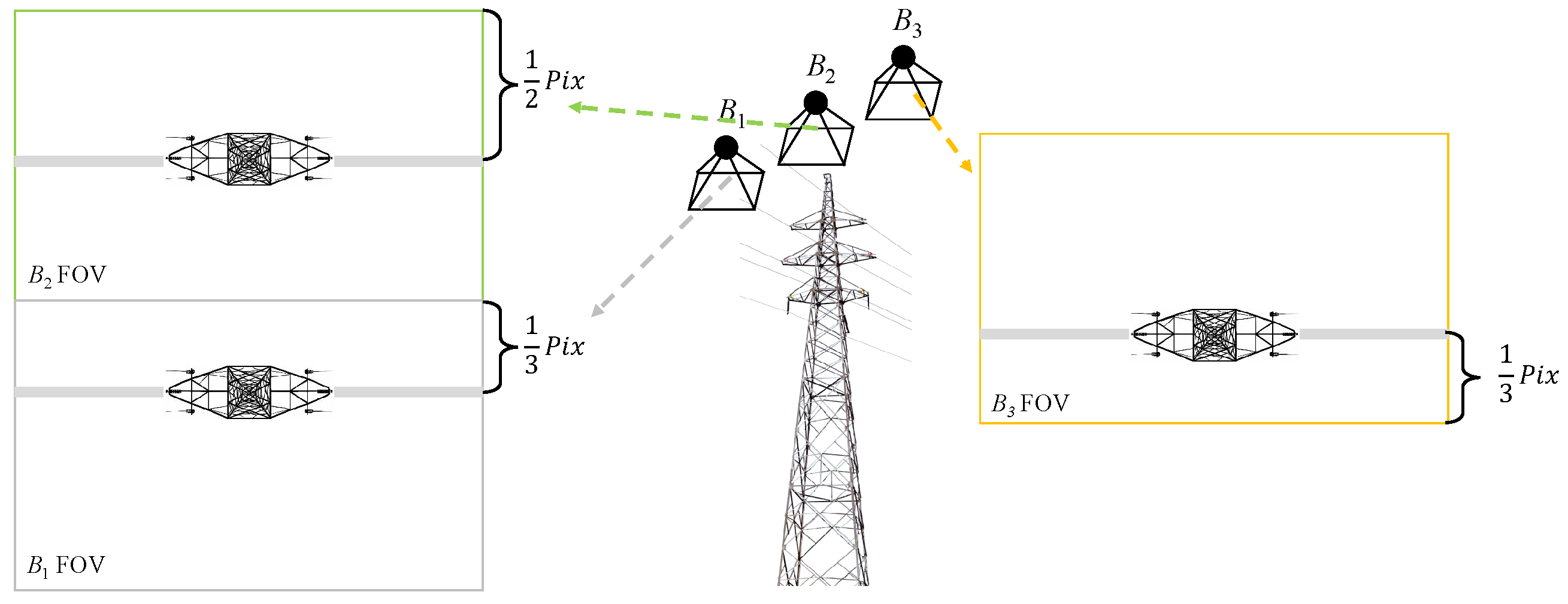Once the UAV finishes stage A, it controls the gimbal view toward the ground. It then enters stage B. At this time, the UAV flies with point B 2 estimated in stage A as the horizontal position target, h r as the altitude target, and ψ 0 as the heading target. In the process of flying towards point B 2 , when the tower head is recognized and its pixel coordinates are located at 1/3 of the image, which is recorded as point B 1 , then the processor sends a flag bit to the UAV to remind the tower head that it has been recognized, ensures that the UAV always remains within the recognized range of the pole tower, hovers and records the pixel coordinates ( Δ W 1 , Δ H 1 ) and the positional coordinates at this point ( l o n 1 , l a t 1 ). When the pixel coordinates are located at 1/2, 2/3 of the image, they are recorded as new B 2 and B 3 points, and the corresponding pixel and position coordinates are ( Δ W 2 , Δ H 2 ), ( l o n 2 , l a t 2 ) and ( Δ W 3 , Δ H 3 ), ( l o n 3 , l a t 3 ).