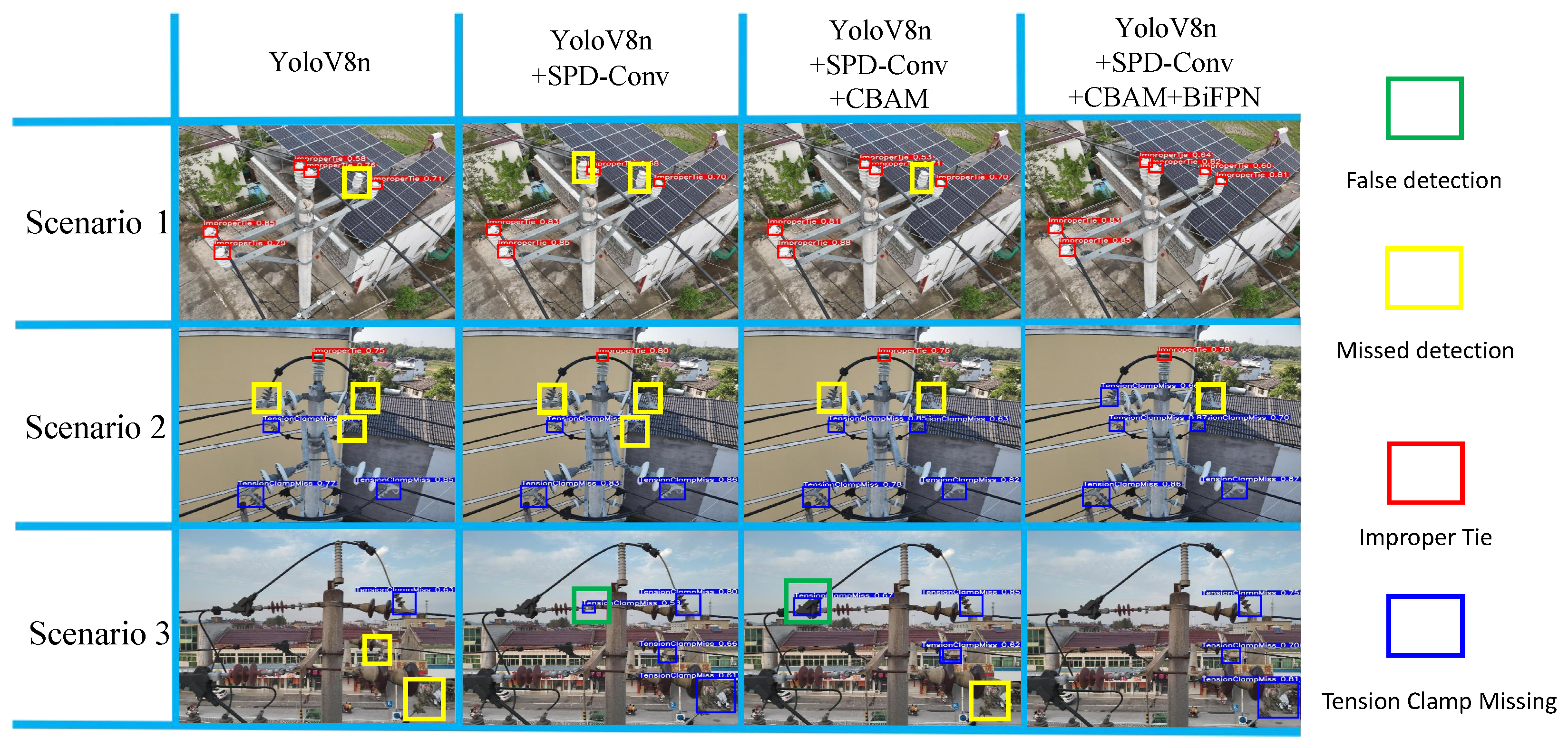 Figure 12. Comparison of ablation experiment test results: From left to right: The baseline model’s detection results show six missed detections and no false positives. The improved detection results from SPD-Conv show five missed detections and one false positive. The improved detection results from SPD-Conv + CBAM show four missed detections and one false positive. The improved detection results from SPD-Conv + CBAM + BiFPN show only one missed detection and no false positives.