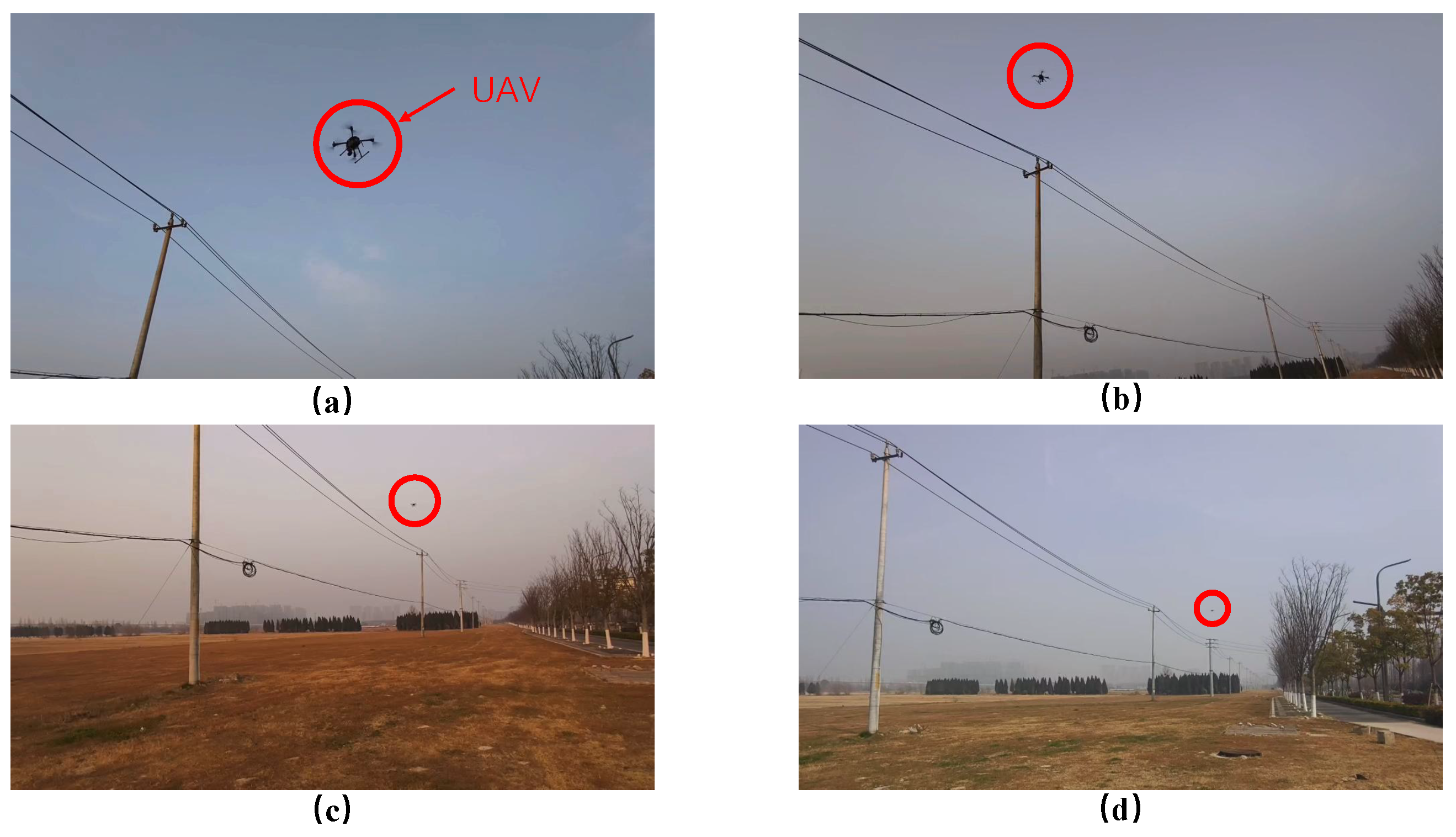 Figure 14. Ground view of actual drone flight: Where (a) is the vertical climbing process of the drone in stage A, and (b) is the deviation correction of the drone above the tower in stage B, (c,d) indicating that the drone is inspecting the secondary and sub-secondary towers in turn.