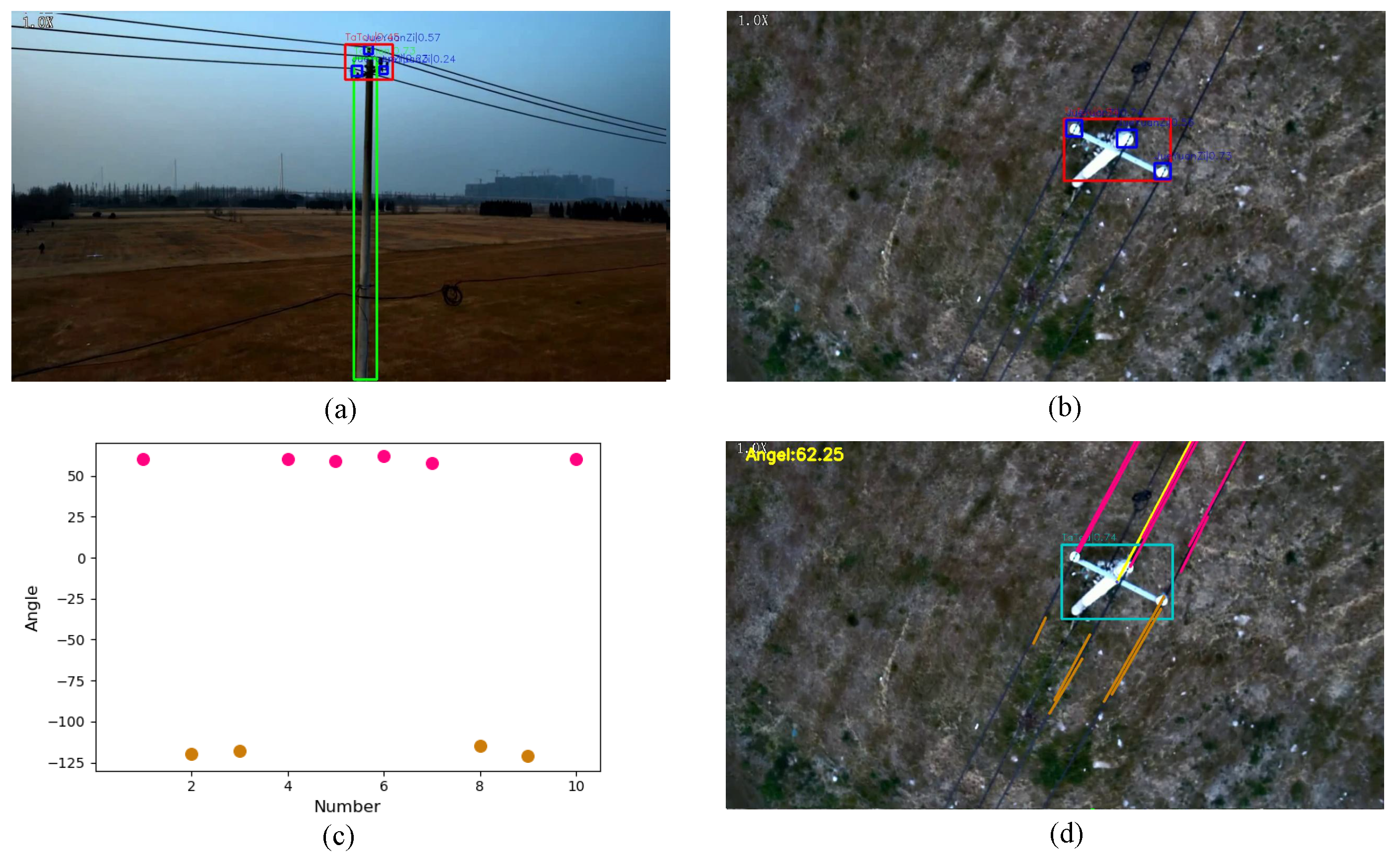 Figure 15. Schematic diagram of the recognition effect of the UAV viewpoint: Where (a) is the recognition effect of the front view of the utility pole tower, (b) is the recognition effect of the top view of the utility pole tower, (c) is the angular clustering analysis diagram, and (d) is the recognition effect of the improved LSD wire detection algorithm. It should be noted that the differently colored dots in (c) correspond to the angles of the wires in (d).