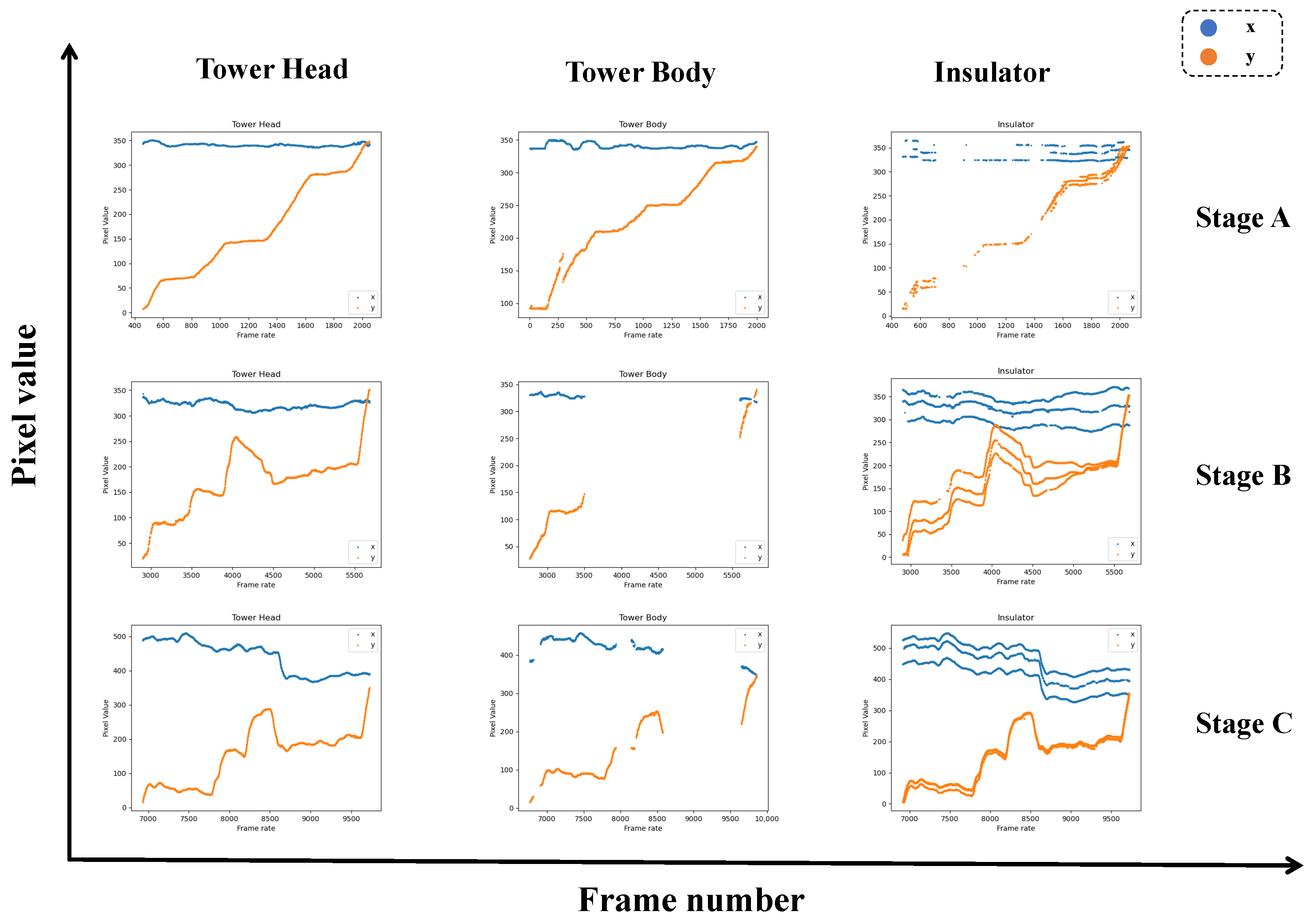 Figure 16. Pixel data for each stage target. In stage A, the insulators were too small, resulting in intermittent pixel recognition. In stage B and C, the drone positioned directly above the tower caused the tower body to be obscured by the tower head and insulators, leading to missing pixels.