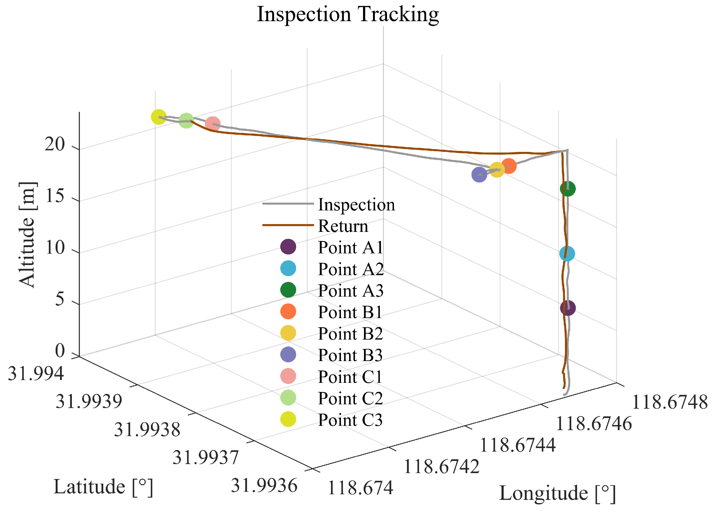 Figure 17. UAV inspection trajectory. The colored dots in the diagram represent key points at various stages of the drone inspection process.