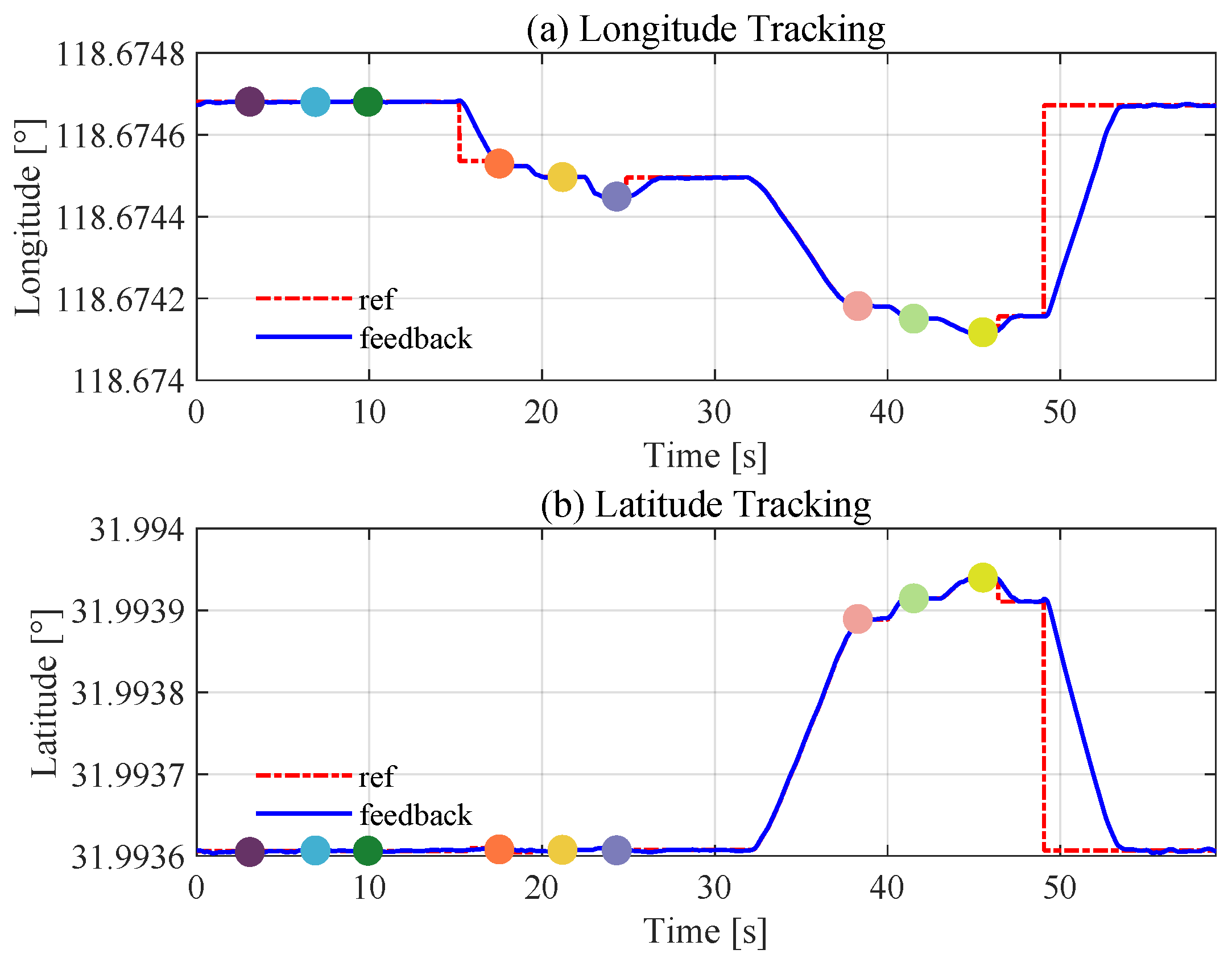 Figure 18. UAV tower coordinate tracking. The step-like and smooth reference trajectories correspond to position control and velocity control stages, respectively; dashed lines denote references, and solid lines denote UAV feedback. The colored dots in the diagram represent key points at various stages of the drone inspection process, corresponding to the dots in Figure 17.