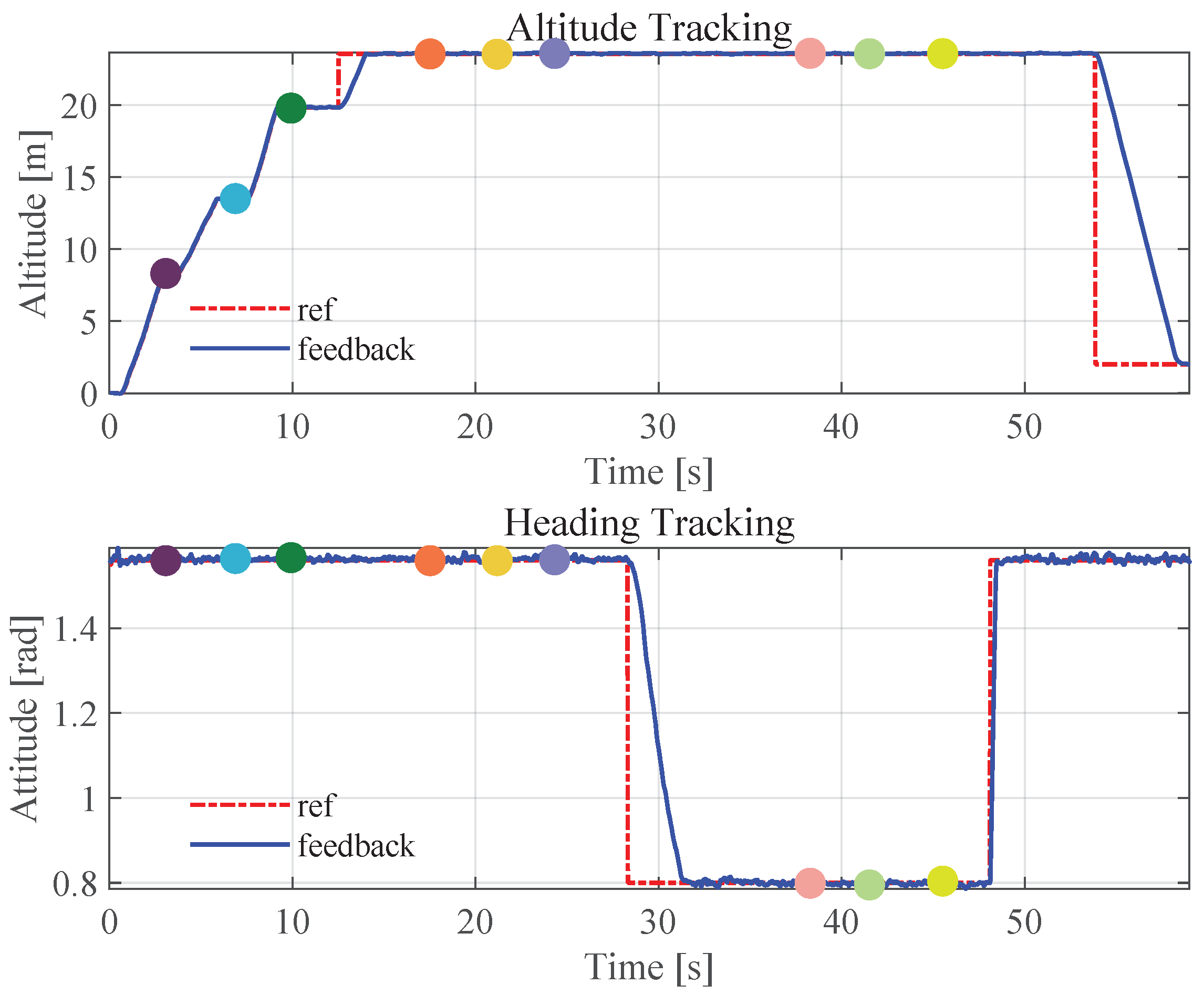Figure 19. UAV altitude and heading tracking. The colored dots in the diagram represent key points at various stages of the drone inspection process, corresponding to the dots in Figure 17.