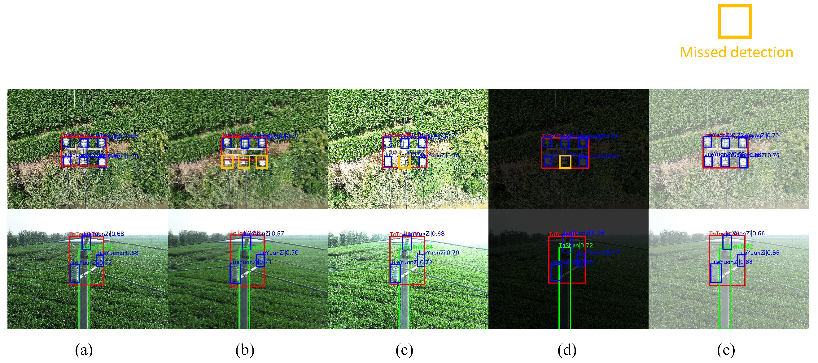 Figure 21. Image recognition under simulated conditions. (a) Simulated drone images under normal lighting conditions. (b) Simulated drone images during flight. (c) Simulated drone images under high-intensity lighting. (d) Simulated drone images in low-light environments. (e) Simulated drone images in rainy and foggy conditions.
