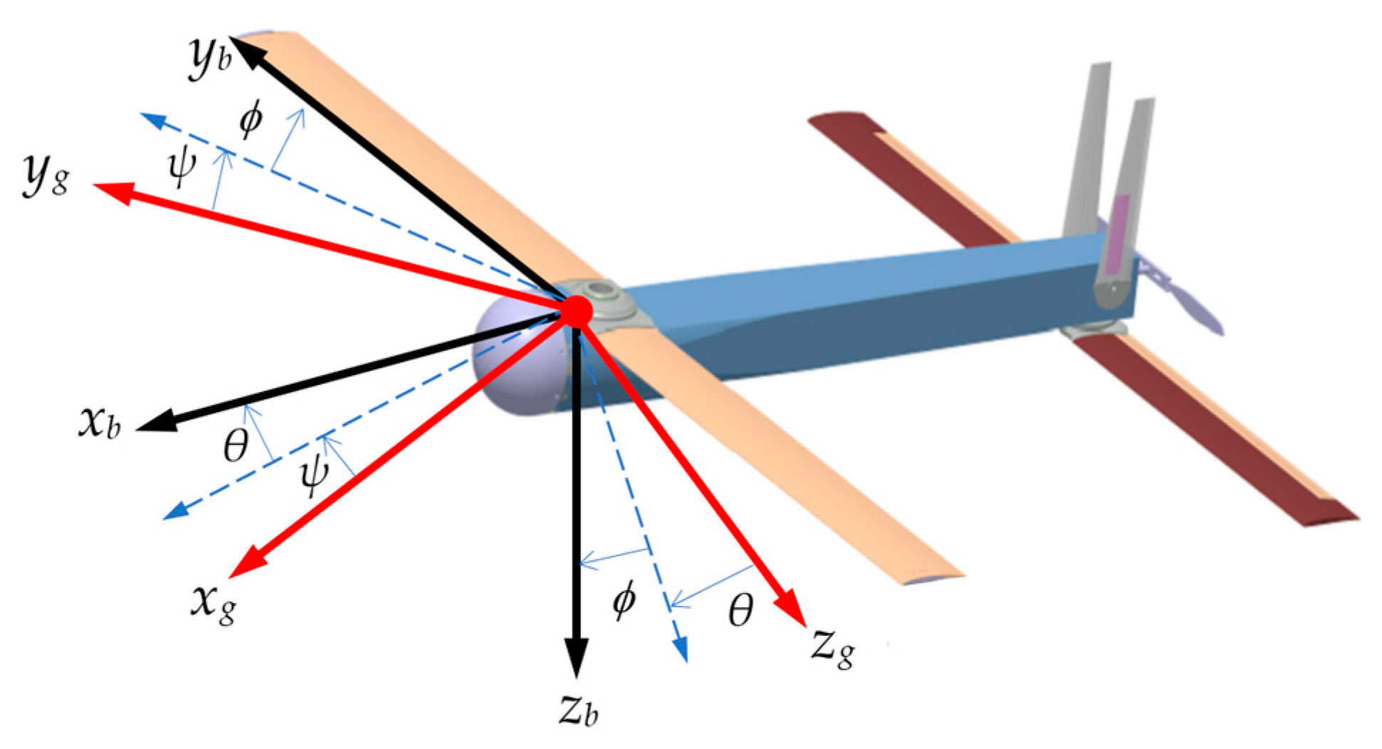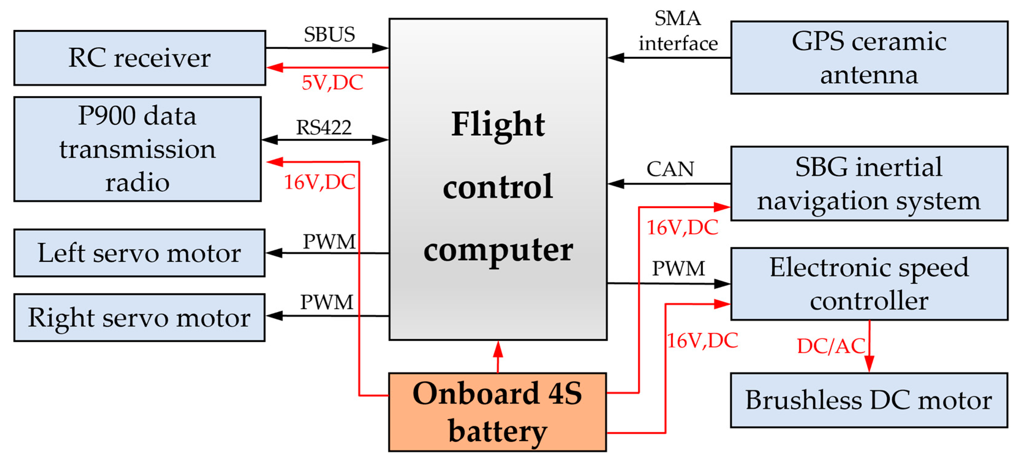 Figure 12. The entire system is powered by a single onboard battery. The propulsion system employs a brushless DC motor. Attitude and overload data are collected by an external inertial navigation unit and transmitted to the flight control computer via the CAN protocol. The GPS antenna adopts a ceramic patch antenna, which allows installation on the compact airframe without compromising aerodynamic performance. The UAV communicates with the ground control station through a data radio. Additionally, for flight test safety, the flight control computer includes a reserved interface for an RC receiver, enabling manual intervention via remote control during emergencies.