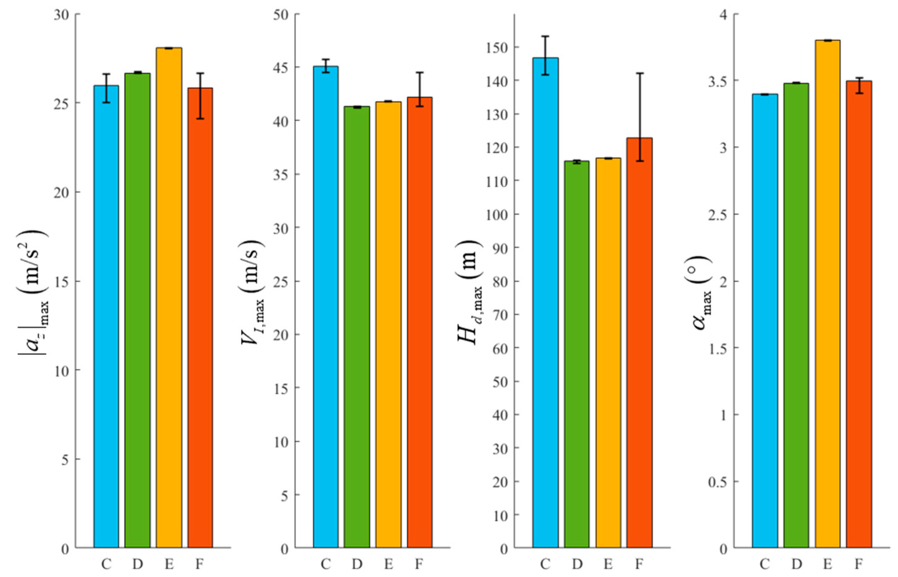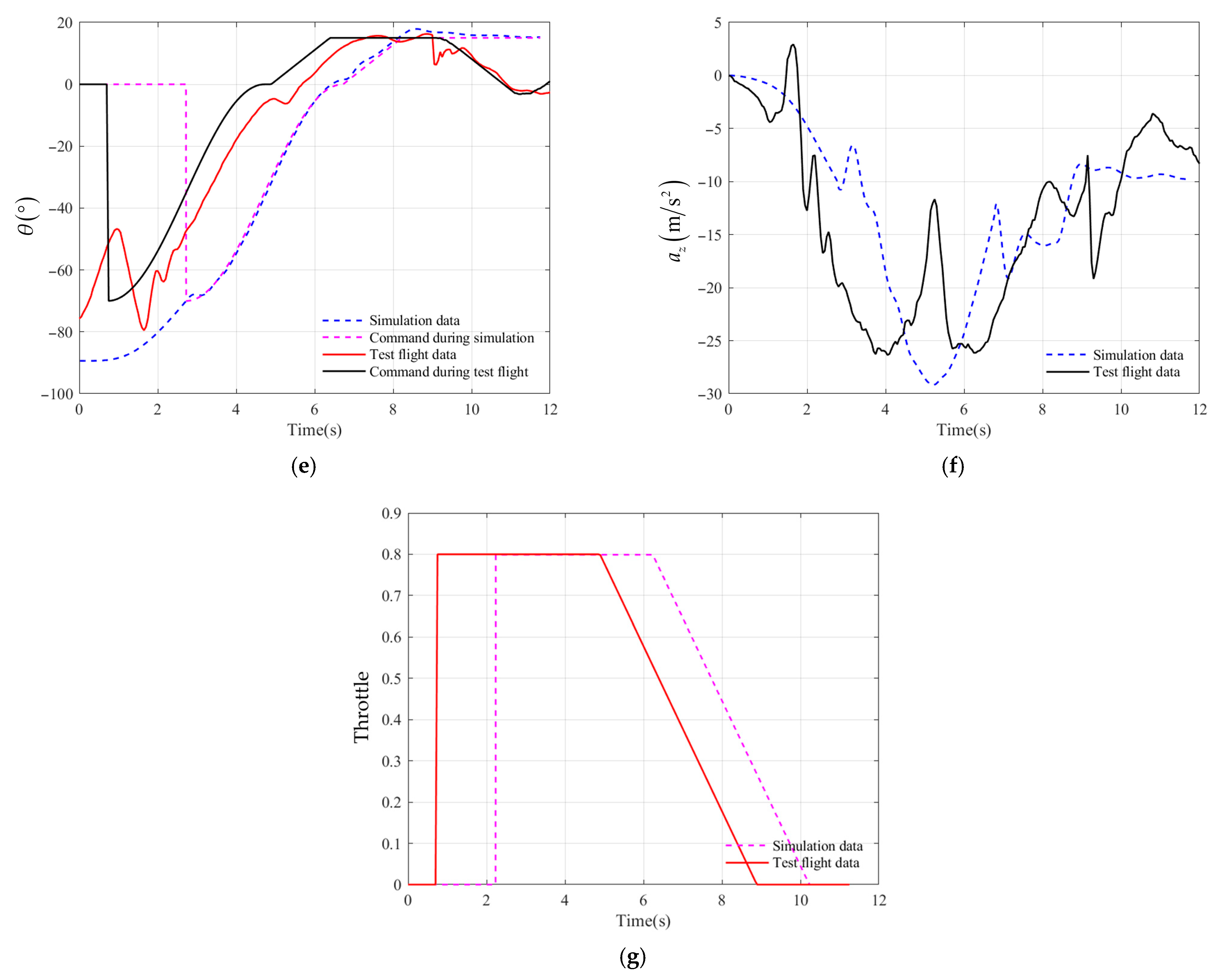5. At around 5 , the throttle command stabilizes, marking the end of the pull-up phase and the transition to cruise mode. Before this point, remained near 0° while gradually decreased. After switching modes, the UAV increased to climb and recover altitude lost during pull-up, causing a sharp rise in and significant change in normal overload due to high airspeed.