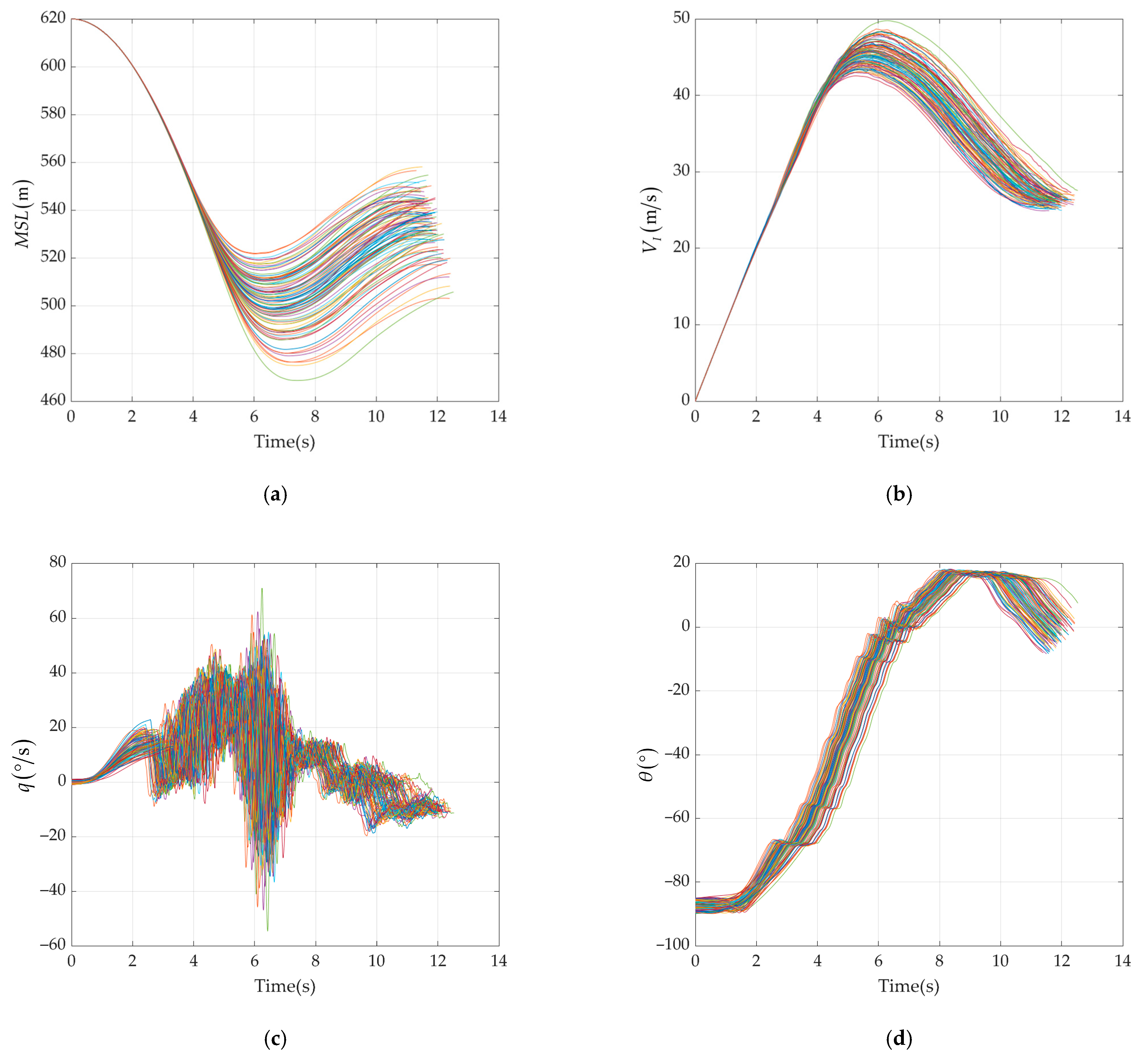 In order to further ensure the robustness of the controller, 100 simulations under random perturbation of conditional parameters were conducted. In addition to the aerodynamic parameters, mass and moment of inertia, initial attitude of the UAV, control surface deflection dead zone, and thrust mentioned in