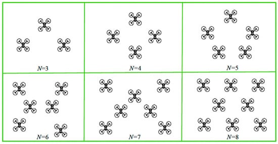 To evaluate the performance of the formation strategy, this paper measures the average time required for the UAV swarm to accomplish formation. Specifically, the Hausdorff distance () between the current swarm topology and the desired formation topology is computed according to []. The formation is considered successfully achieved once the formation error satisfies .