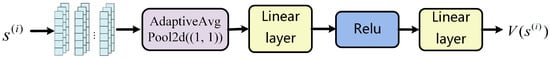 Based on the structural design of the aforementioned semantic encoder, its optimization process adopts an actor–critic architecture. Specifically, the actor component performs action sampling using the Gaussian policy in Equation (10), while the Critic component takes the high-dimensional semantic representation as input to evaluate the current state value. As illustrated in Figure 4, the value network of the PPO-driven semantic encoder is designed accordingly. In particular, the input vector is first compressed via adaptive average pooling to obtain a compact semantic representation. This representation is then processed through a linear layer followed by a ReLU activation function, ultimately producing the state value estimate , which is subsequently used for advantage computation to guide policy updates.