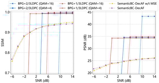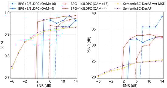 - BPG+LDPC []: The BPG encoder (https://github.com/def-/libbpg (accessed on 24 September 2025)) enables efficient image compression, while the 5G LDPC encoder (https://github.com/NVlabs/sionna (accessed on 24 September 2025)) achieves high-performance channel error correction through sparse matrix design. To further compare the proposed semantic communication mechanism with conventional communication systems, the BPG and LDPC coding schemes are extended to the semantic broadcast communication scenario, employing standard 5G LDPC coding rates and different orders of quadrature amplitude modulation (QAM) for simulation. Specifically, LDPC coding schemes with rates of 2/3 (corresponding to code length (3072,4608)) and 1/3 (corresponding to code length (1536,4608)) are adopted, combined with 4-QAM and 16-QAM modulation for communication simulations.