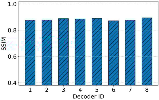 This study first compares the image transmission performance of various semantic broadcast communication schemes for UAV swarm broadcast communications under different channel conditions, including the conventional BPG+LDPC approach and the widely used semantic communication method optimized via the MSE loss function. Specifically, Figure 6 illustrates the variation in image reconstruction quality under an AWGN channel, with the signal-to-noise ratio (SNR) ranging from dB to dB. Under the fixed-noise assumption, SemanticBC consistently achieves higher SSIM than the baselines across the tested SNR range, indicating it can maintain comparable image quality with lower transmit power and thus reduce communication energy consumption. As observed, the conventional BPG+LDPC scheme (with different coding rates of and , as well as different QAM modulation orders) exhibits a pronounced cliff effect: the reconstructed image quality is extremely poor and nearly unrecoverable at low SNRs, yet experiences a sharp performance surge once the SNR exceeds a certain threshold. By contrast, both SemanticBC-DecAF and SemanticBC-DecAF w/t MSE demonstrate a smooth and continuous growth trend, where the proposed SemanticBC-DecAF consistently maintains higher SSIM and PSNR values. This validates that the PPO optimized semantic encoder can effectively balance receiver performance and achieves clear advantages over conventional MSE-based semantic broadcast communication schemes. Figure 7 presents the SSIM performance across multiple decoders for UAV swarm transmissions under the AWGN channel at SNR = −2 dB. The results indicate that the reconstructed image quality remains uniformly high, exhibiting only marginal discrepancies among different receivers. This consistency highlights the robustness and efficacy of the proposed approach.