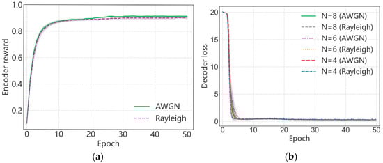 Figure 9 illustrates the convergence behavior of the proposed SemanticBC-DecAF framework, which incorporates an alternating training mechanism tailored for semantic broadcast communication. Specifically, Figure 9a,b present the variation trends of the semantic encoder’s average reward and the semantic decoder’s reconstruction loss, respectively. As shown in Figure 9a, under both AWGN and Rayleigh fading channels, the semantic encoder achieves a rapid increase in the average reward within the first training epochs, followed by a steady plateau. This indicates that the PPO algorithm enables the encoder to efficiently learn a semantically meaningful and channel adaptive representation. Moreover, the reward curves under different channel conditions exhibit minimal divergence, demonstrating the encoder’s robustness to channel variability. Figure 9b further shows the average reconstruction loss of the semantic decoders under different channels and different numbers of receivers (). In all configurations, the loss converges rapidly to a low value within approximately epochs, with limited oscillation, indicating strong convergence stability and generalization capability. In addition, the variation in the number of receivers has a limited impact on the final loss, further validating the scalability of the proposed method in multi-agent broadcast communication scenarios.