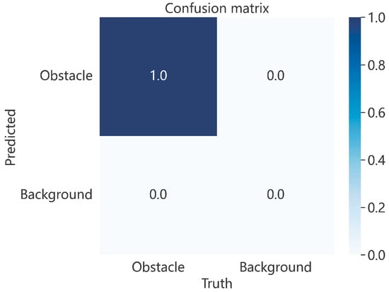 To further evaluate the effectiveness of the object detection and position estimation modules within the SemanticBC-DecAF framework under semantic broadcast communication scenarios, assessments are conducted from two perspectives: model convergence during the training phase and object recognition performance during the testing phase. Specifically, Figure 10 presents the confusion matrix generated during the testing phase. As observed, the model achieves a high classification accuracy for the “obstacle” category, reaching accuracy with no background misclassification. These results indicate that the proposed framework maintains a stable and reliable object detection capability, even when relying on images transmitted via semantic broadcast communication.