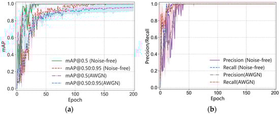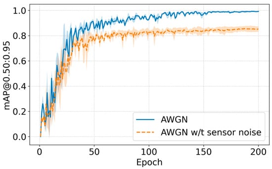 To further evaluate robustness under realistic conditions, background noise induced by sensor estimation uncertainties was incorporated into the received images. As illustrated in Figure 12, within the AWGN channel, the presence of such noise leads to a discernible reduction in mAP@0.50:0.95 and a marked increase in variance across evaluation epochs. These findings indicate that sensor-related background noise not only undermines detection accuracy but also compromises the reliability and consistency of object detection and localization.