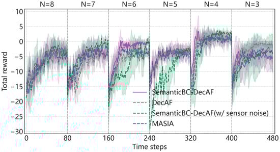 To evaluate the adaptive formation performance based on policy distillation as discussed in Section 3.3, Figure 14 illustrates the temporal evolution of total reward under both formation and obstacle avoidance tasks. During the UAV swarm’s progression, every time steps, a randomly selected follower UAV is removed from the swarm and becomes unobservable. The experiments are conducted across formation sizes ranging from to , and reward curves are recorded accordingly. As shown in Figure 14, following each perturbation, SemanticBC-DecAF is capable of rapidly restoring the reward to a higher level, with its advantage becoming more pronounced under larger formation sizes (e.g., to ). This observation indicates that the incorporation of semantic broadcast communication enhances the agents’ perception of global obstacle and formation information, thereby improving the efficiency and stability of formation reconfiguration under dynamic structural variations. To account for sensing uncertainties, Gaussian noise was injected into the position estimates of the object detection and position estimation module. As illustrated in Figure 14, the proposed SemanticBC-DecAF framework maintains rapid adaptability and stable formation performance under varying swarm sizes, even in the presence of sensor noise. Consequently, the proposed framework exhibits strong adaptability in handling variations in swarm size and is able to promptly re-establish the formation when internal changes occur within the UAV swarm. Additionally, compared to the MASIA [] algorithm, which focuses on self-supervised information aggregation, SemanticBC-DecAF demonstrates better performance in quickly recovering formation and maintaining stability under dynamic changes. While MASIA excels in large-scale coordination, SemanticBC-DecAF’s use of semantic broadcast communication provides superior adaptability in the presence of perturbations and sensor noise, making it more effective for swarm reconfiguration.
