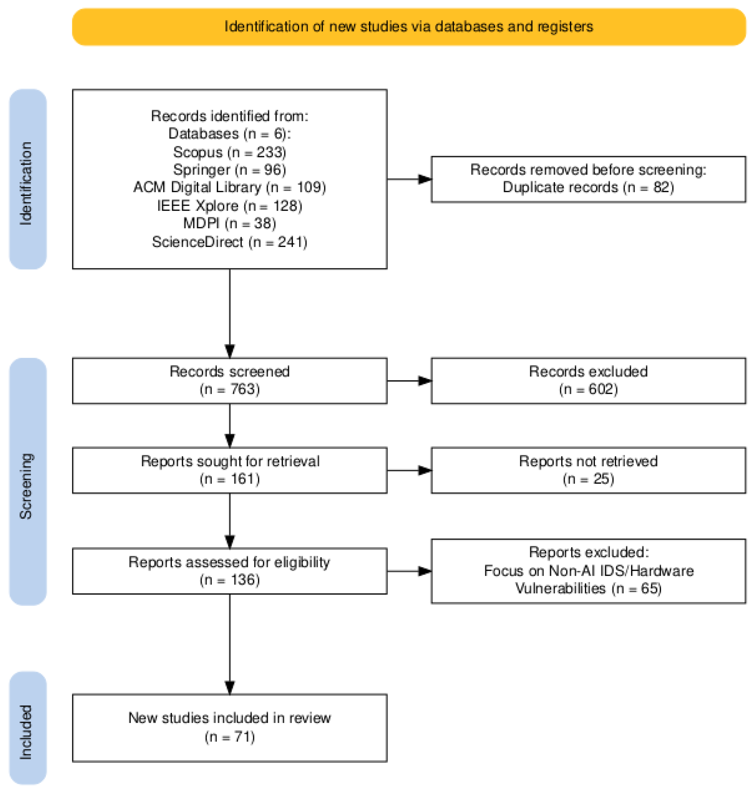 - Study Identification: We searched six major digital libraries—IEEE Xplore, ACM Digital Library, Elsevier ScienceDirect, MDPI, Scopus, and SpringerLink—for English-language publications from 1 January 2020 to 31 May 2025. Queries were frozen prior to screening, and results were de-duplicated by DOI/title. To minimize omission risk, we also cross-checked hits via Google Scholar for missing peer-reviewed counterparts. Database-specific query strings were: