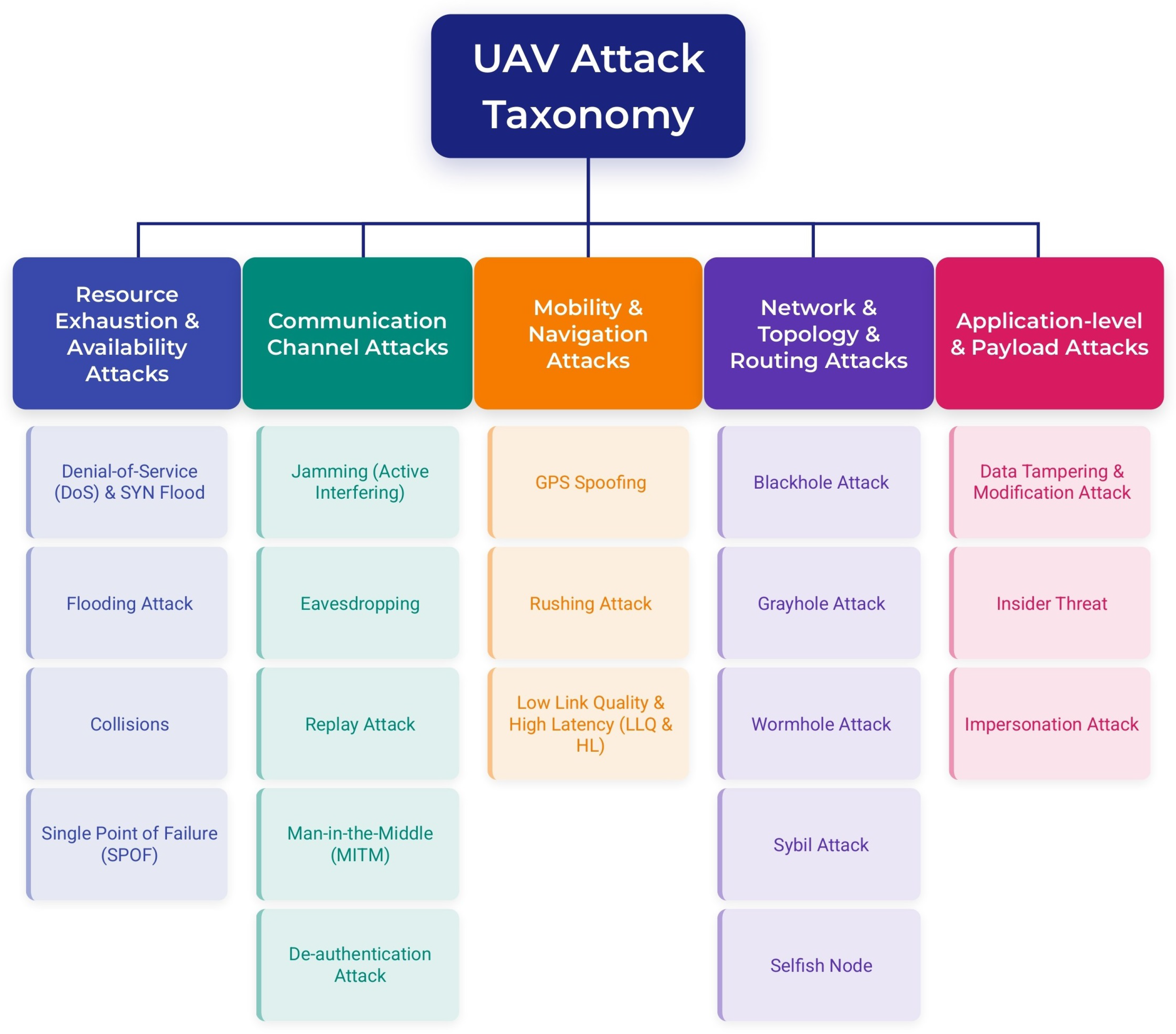 - Eavesdropping: Eavesdropping attacks intercept UAV communication to gather sensitive or classified data, violating confidentiality and potentially enabling further attacks, such as replay or impersonation [12].