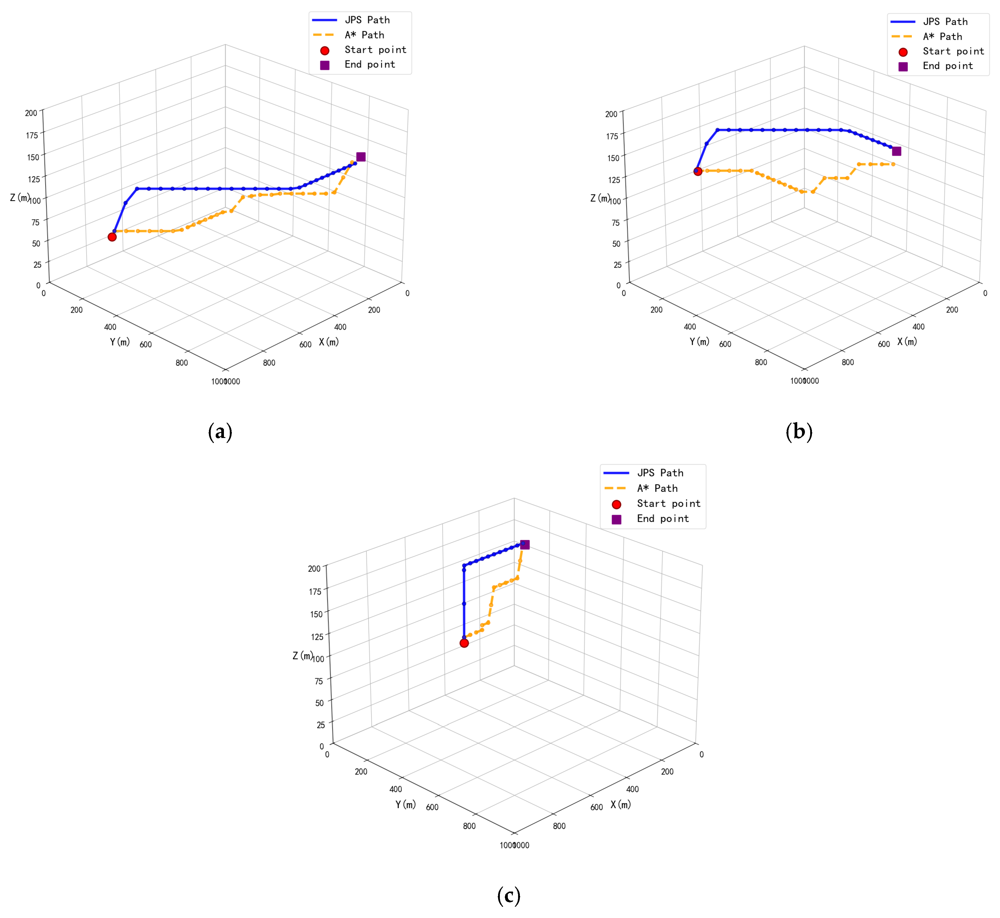 When the number of UAVs is relatively small, each iteration resolves one path conflict, as illustrated by the curves for 40 UAVs (blue curve) and 80 UAVs (red curve). The conflict resolution process exhibits a linear decline until all conflicts are resolved. As the scale of UAVs increases, exemplified by the 120-UAV scenario (green curve), the number of conflicts shows slight oscillations during the iterative process—such as at the 12th and 25th iterations—where the conflict count temporarily increases. This phenomenon occurs due to the high density of UAVs in constrained airspace, resulting in strong coupling among planned paths. During conflict resolution via binary tree replanning, the decoupling of one conflict may inadvertently introduce new coupled conflicts, leading to occasional fluctuations in the curve and imposing certain limitations on the algorithm’s conflict resolution capacity. Nevertheless, as the number of iterations increases, the proposed method (DOCBS + IJPS) remains capable of generating constraint-compliant conflict-free paths even for large-scale UAV fleets, thereby validating its overall conflict resolution performance.